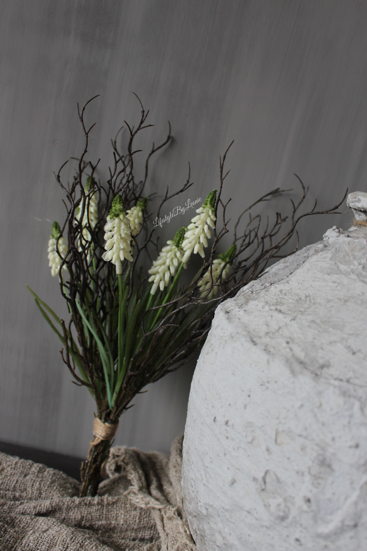 Boeketje met kunst Druifjes met witte bloemetjes en berken takjes. Deze toef is 40 cm groot.
