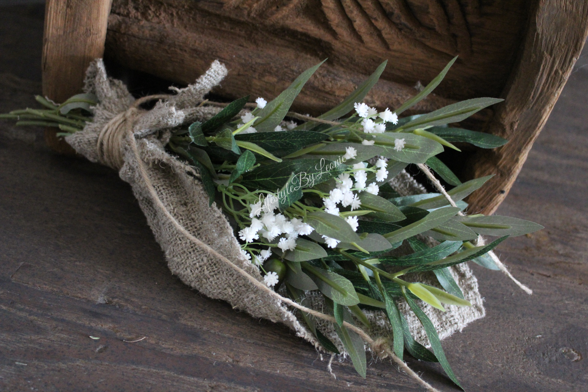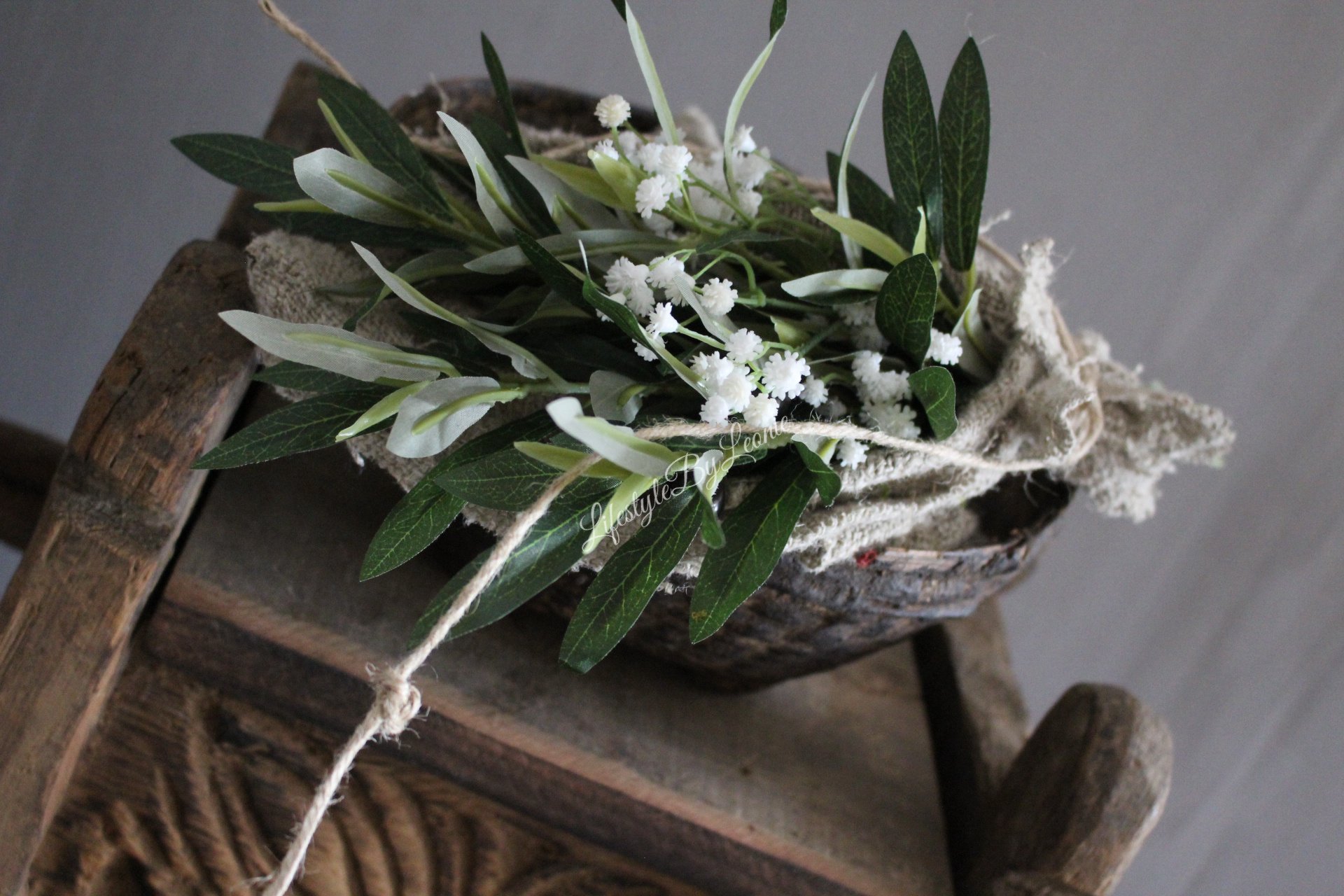 Mooie toef in een shabby doek gemaakt van een zijden Olijftak en kunst Gipskruid. Gezellig en altijd groen.