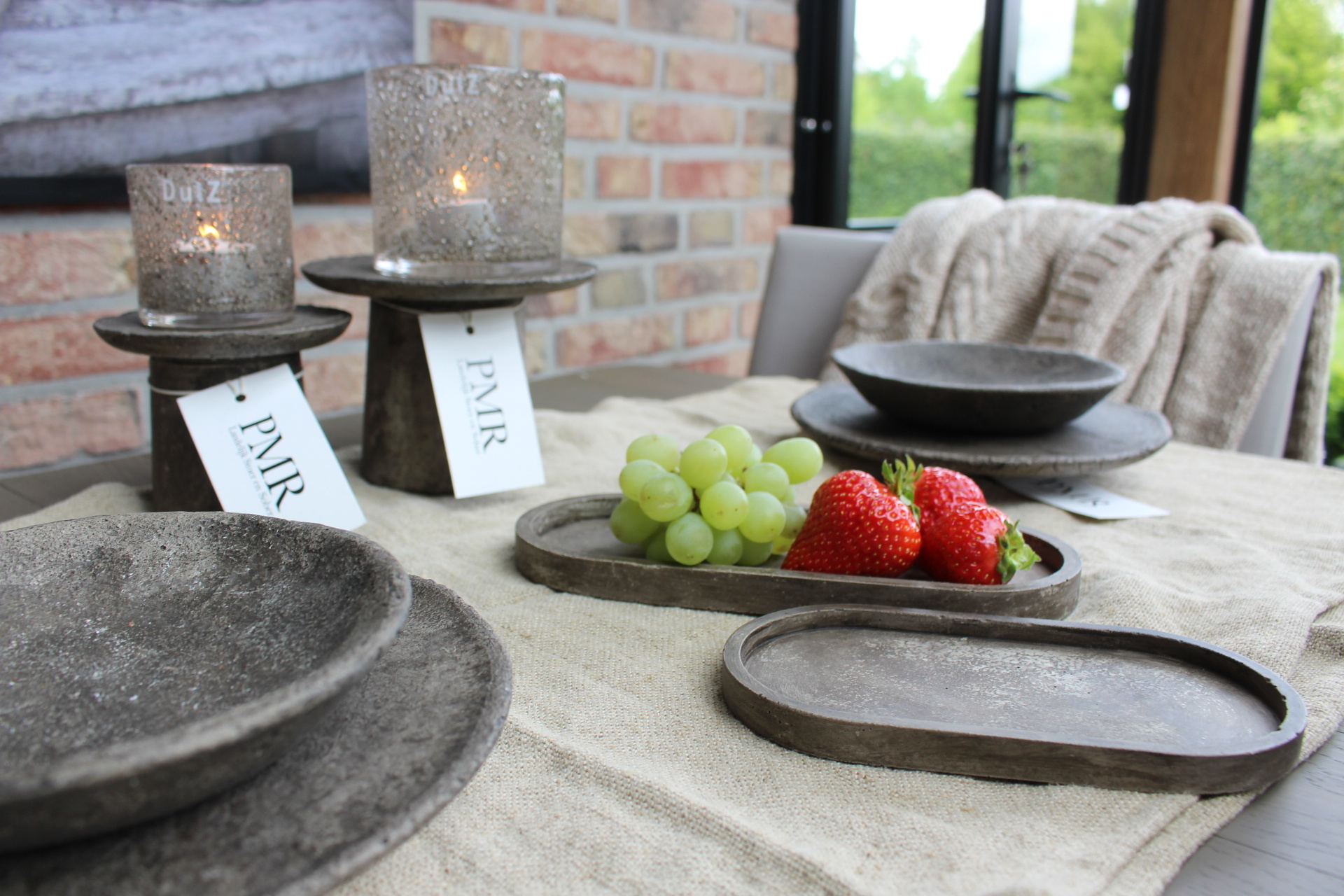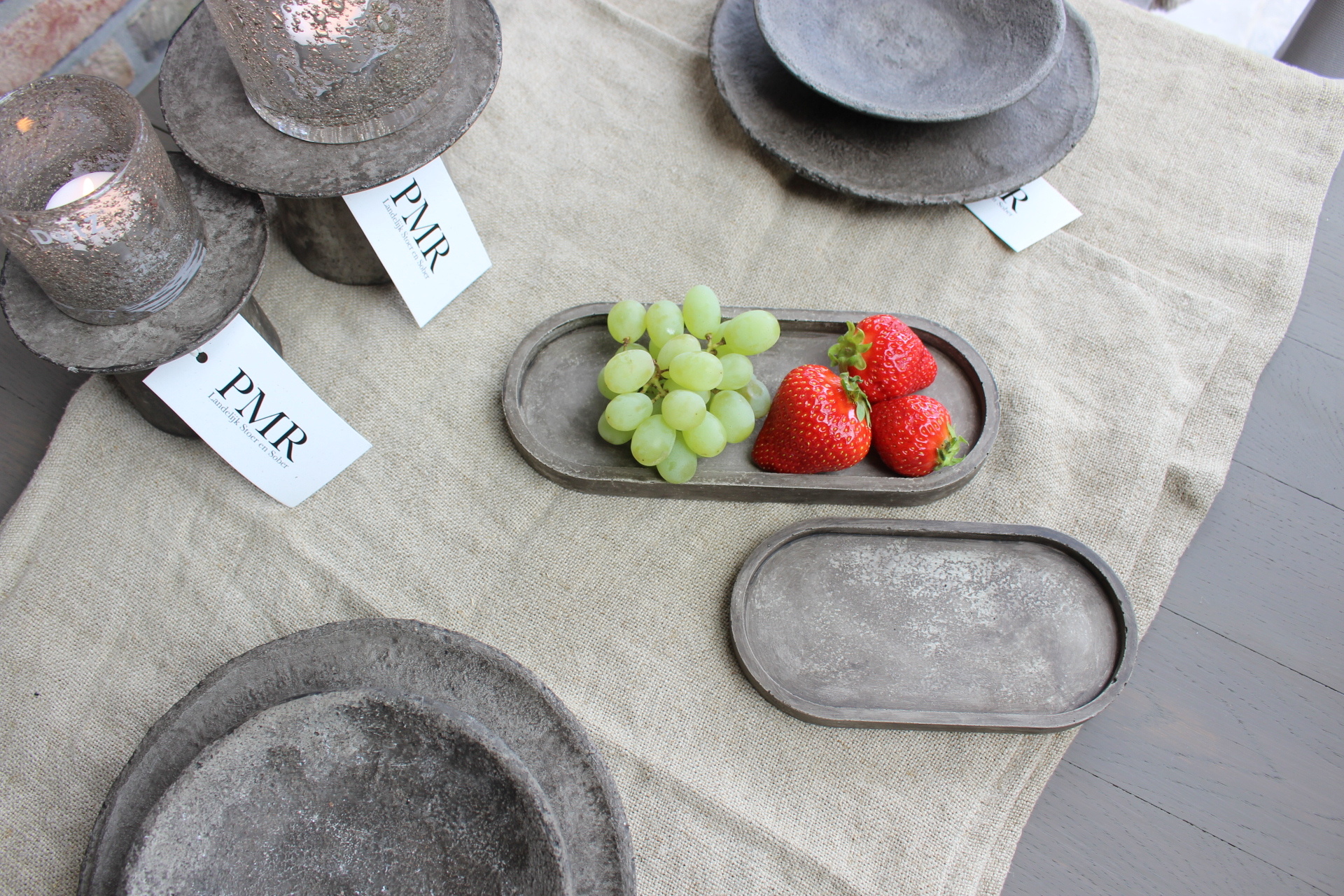 PMR ovale betonnen schaal. Handig om een kopje koffie, bonbons of wat fruit op te serveren. De schaal is 23 cm lang.