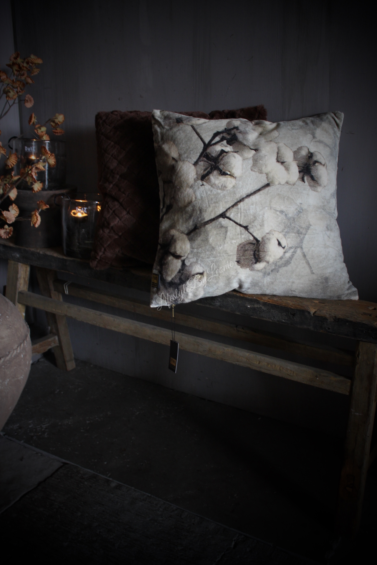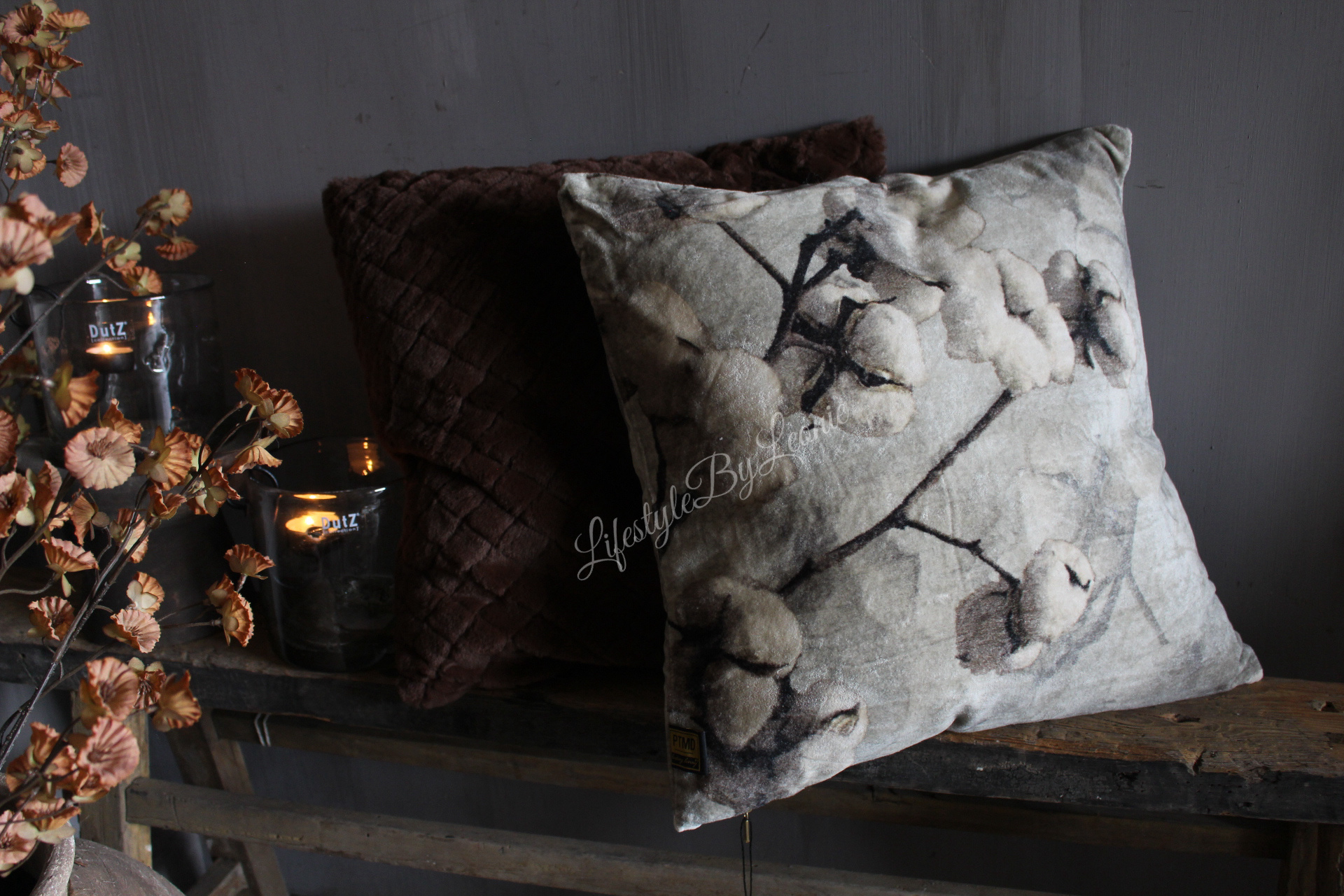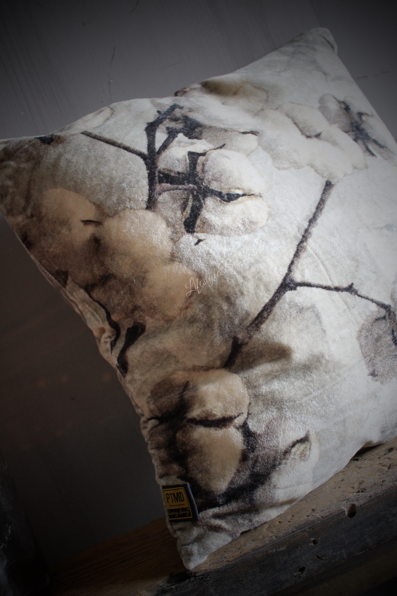 Prachtig velours kussen van PTMD met een sobere opdruk in een lichtgrijze kleur. Het kussen is 45 x 45 cm groot.