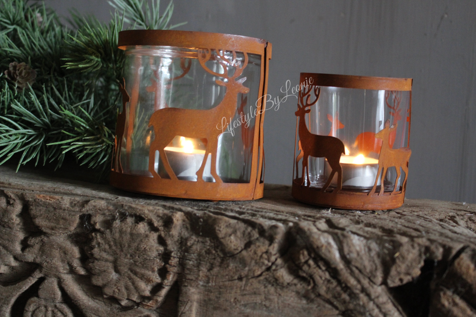 Glazen windlicht met decoratieve roestige hertjes eromheen. Het windlicht is 10,5 cm groot. Ook leuk in combinatie met de kleinere maat.