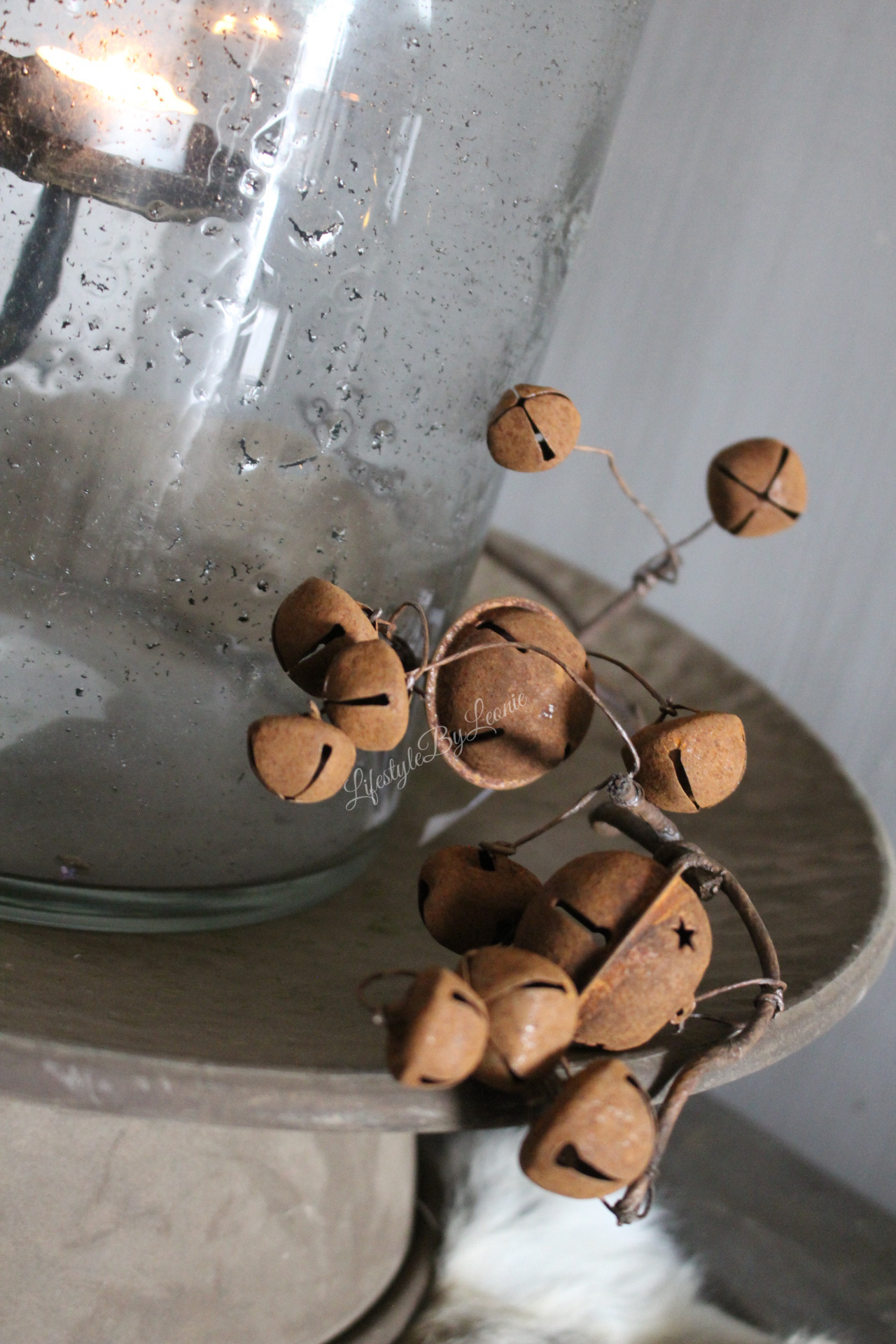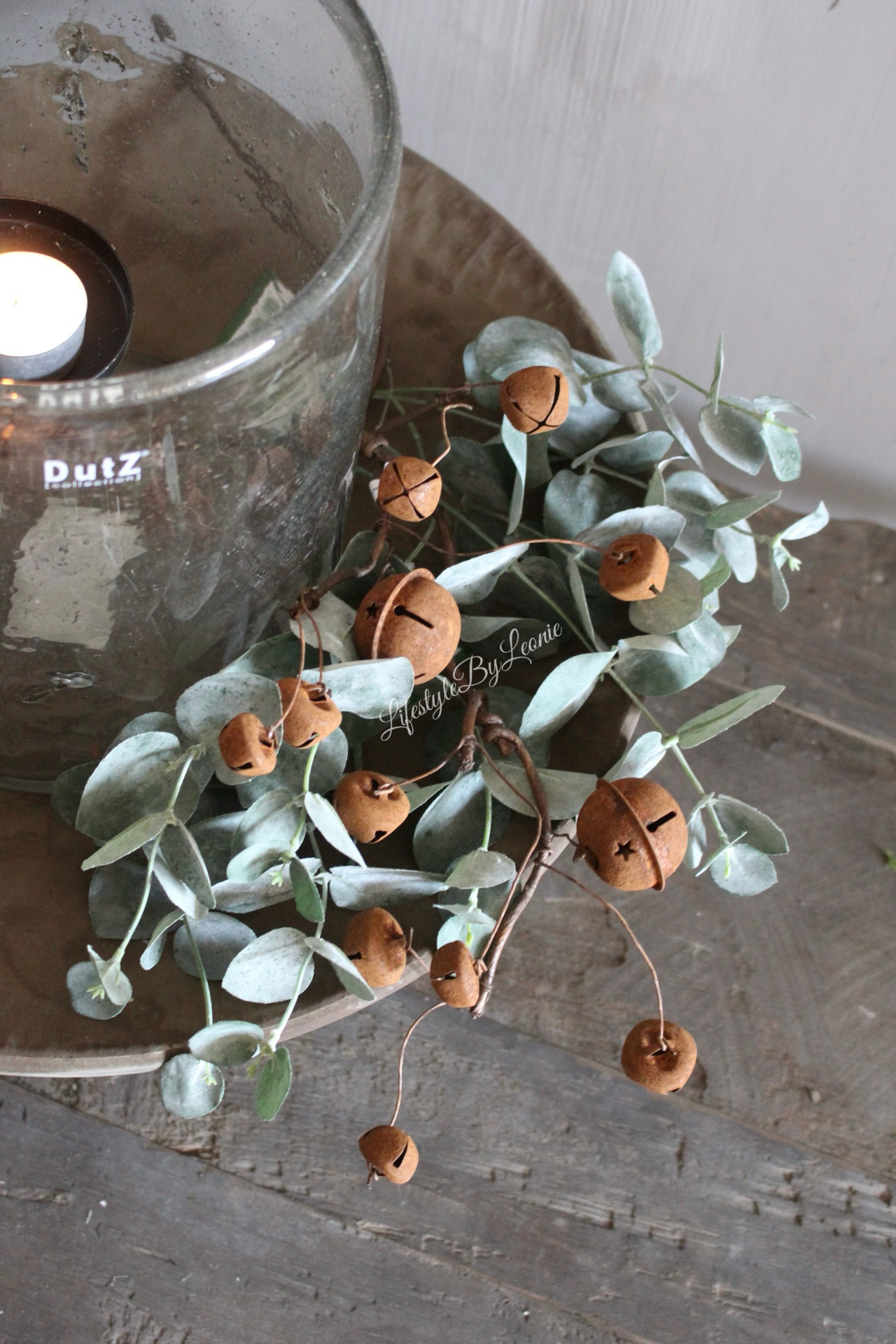 Mooie roestige kerstbelletjes aan een draad. Leuk en decoratief in een krans, toef of doek. De draad is alle kanten op te buigen en is 50 cm lang.