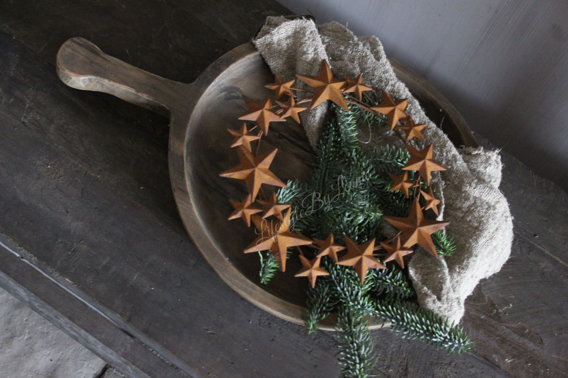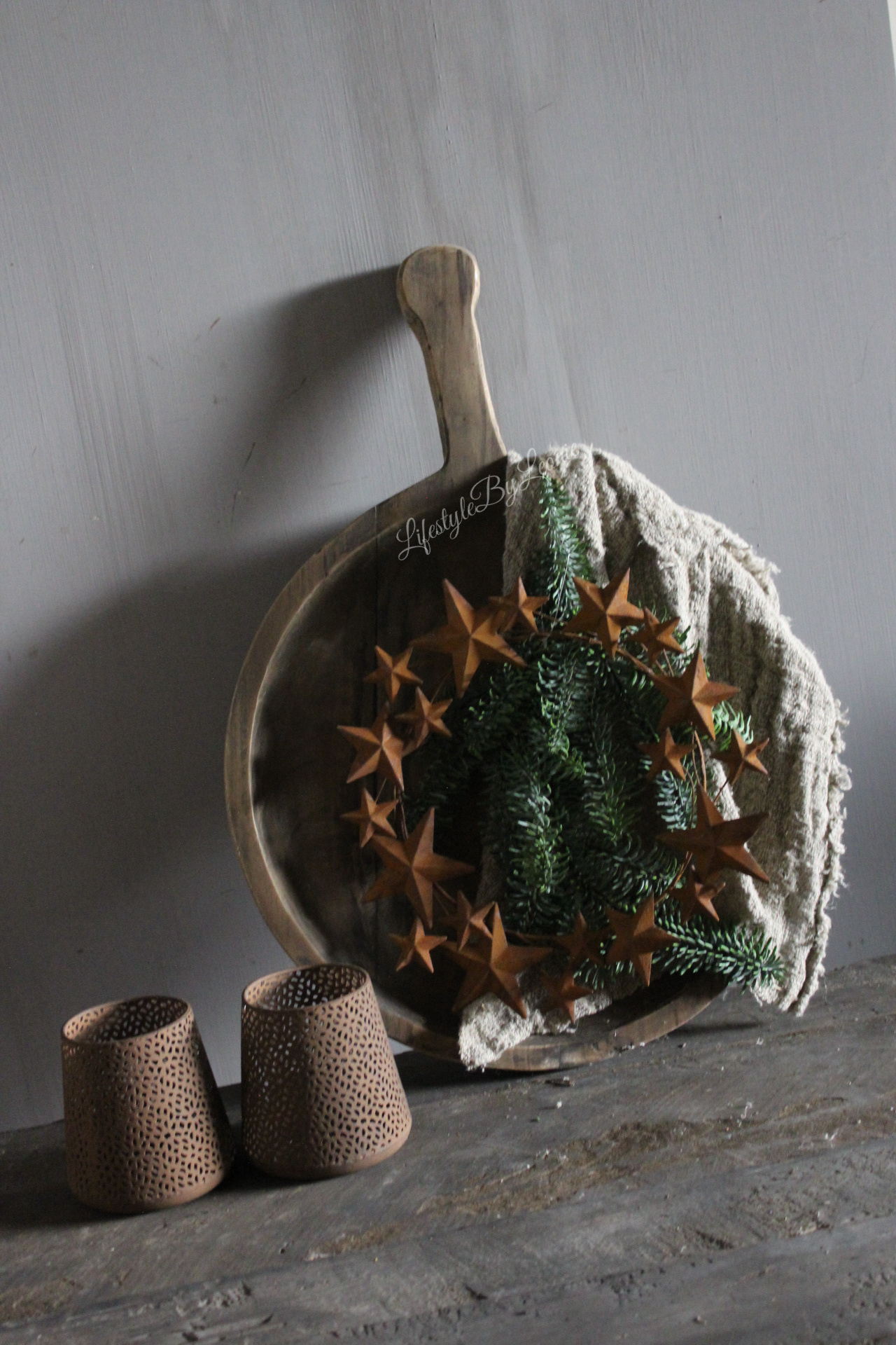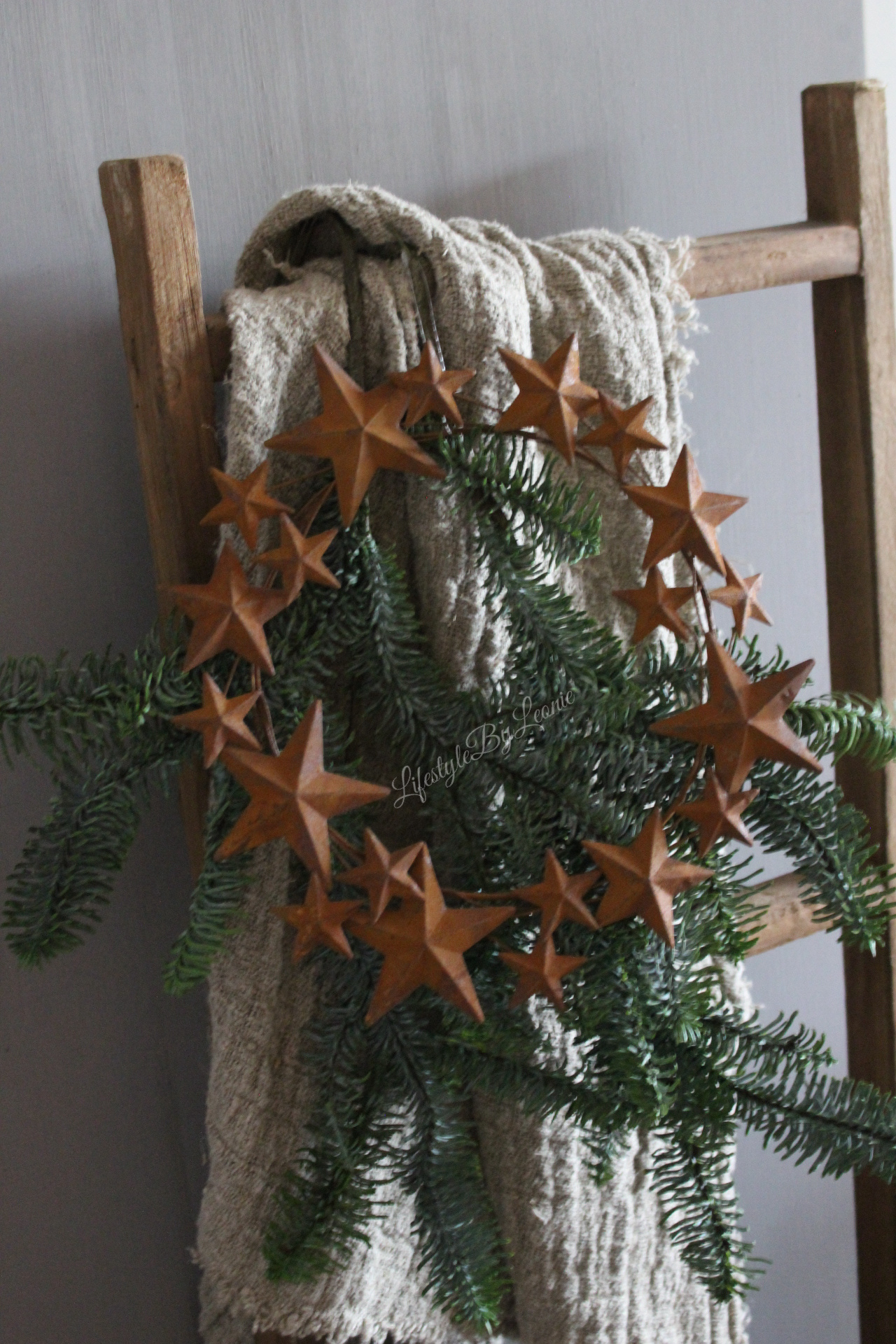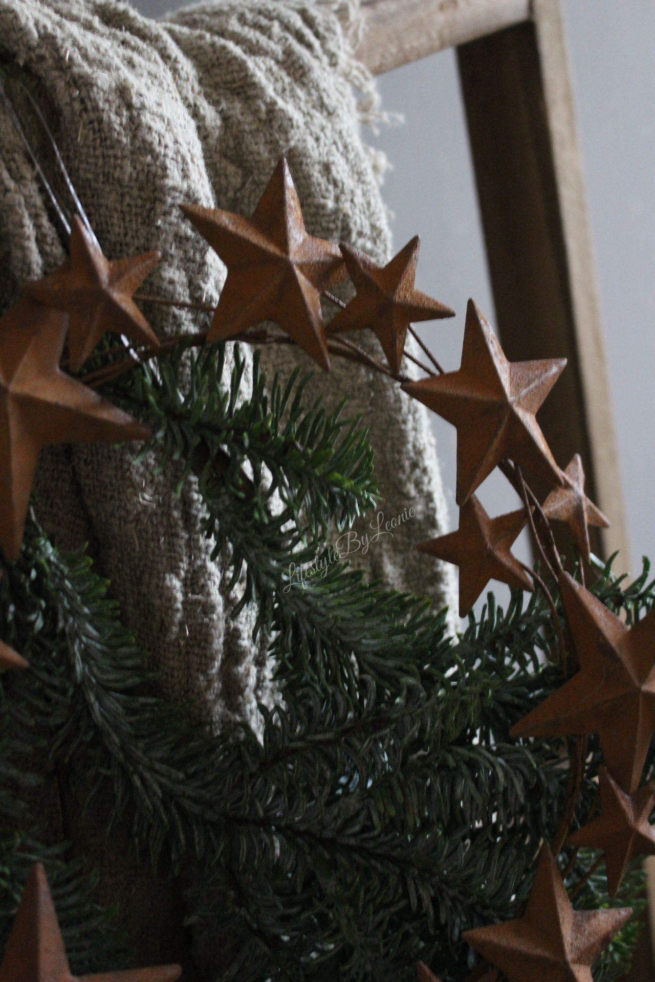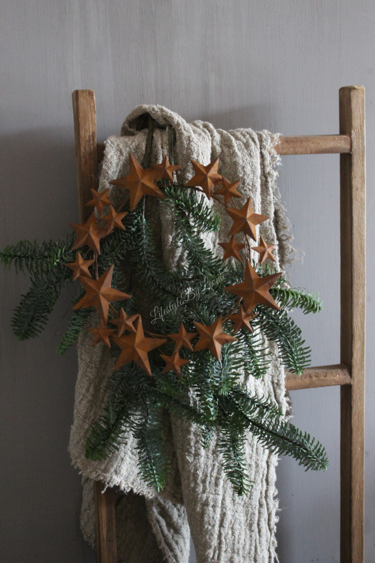 Mooie sobere krans met roestige sterren. Leuk om op te hangen of op een dienblad te leggen. De krans heeft een diameter van 35 cm.