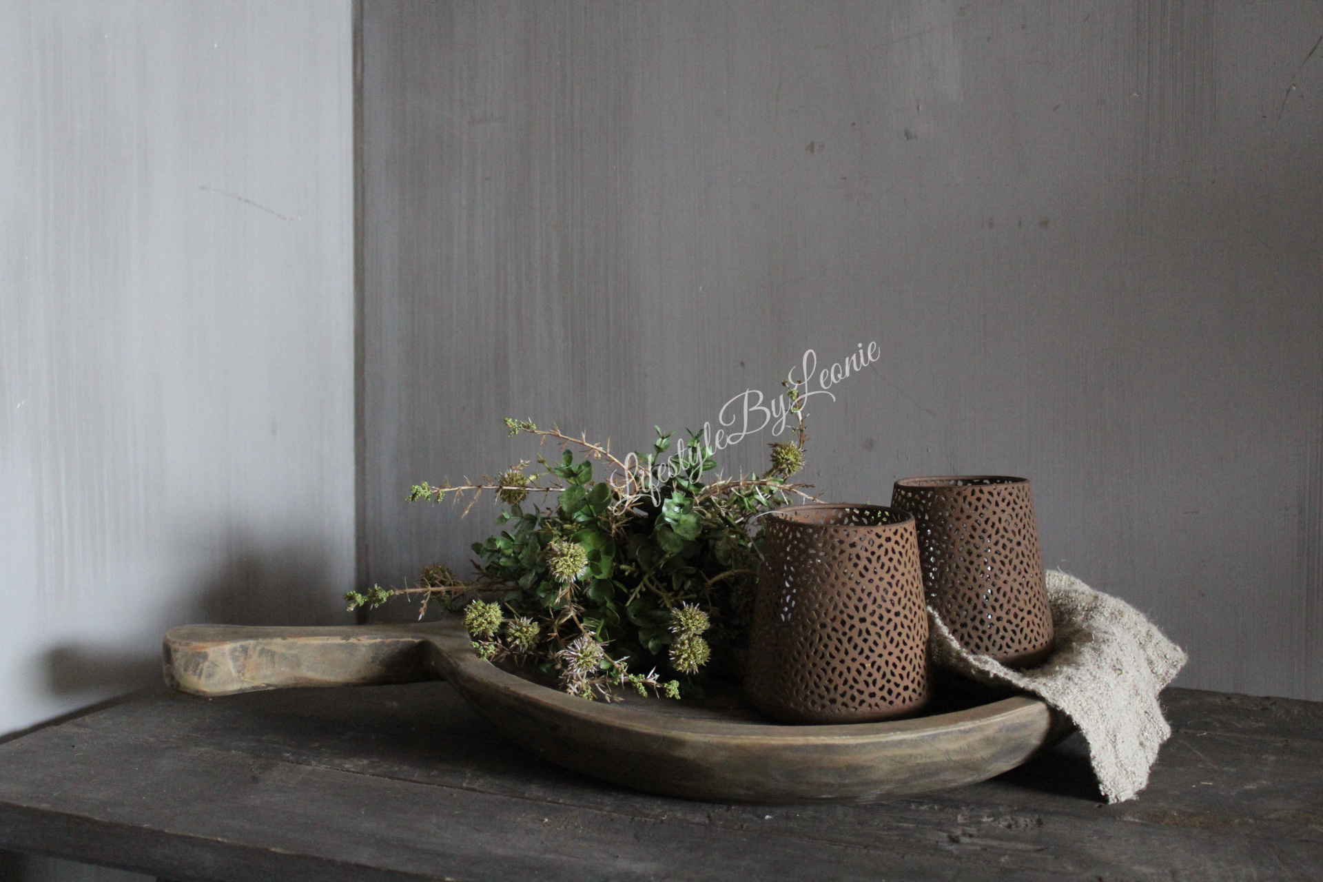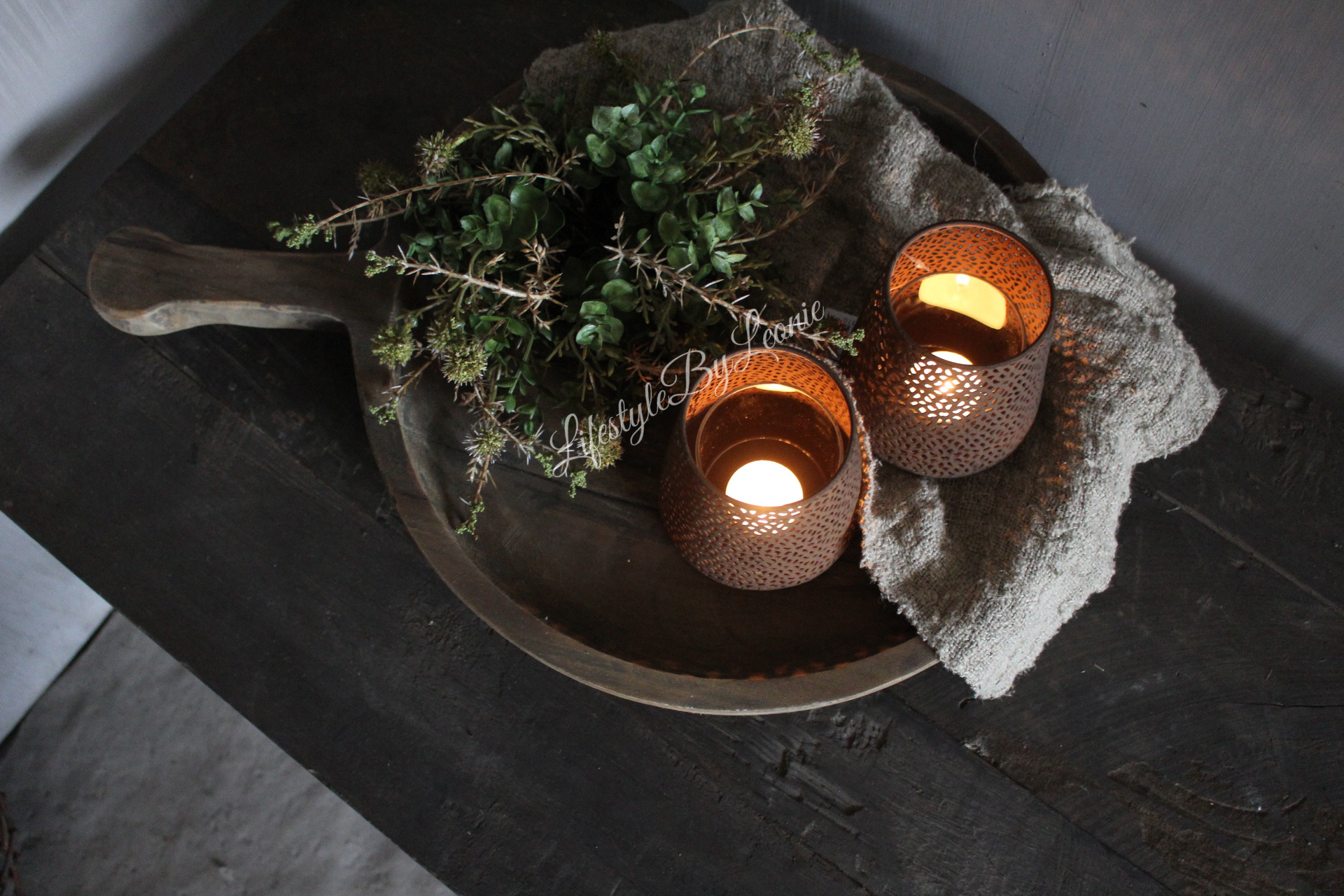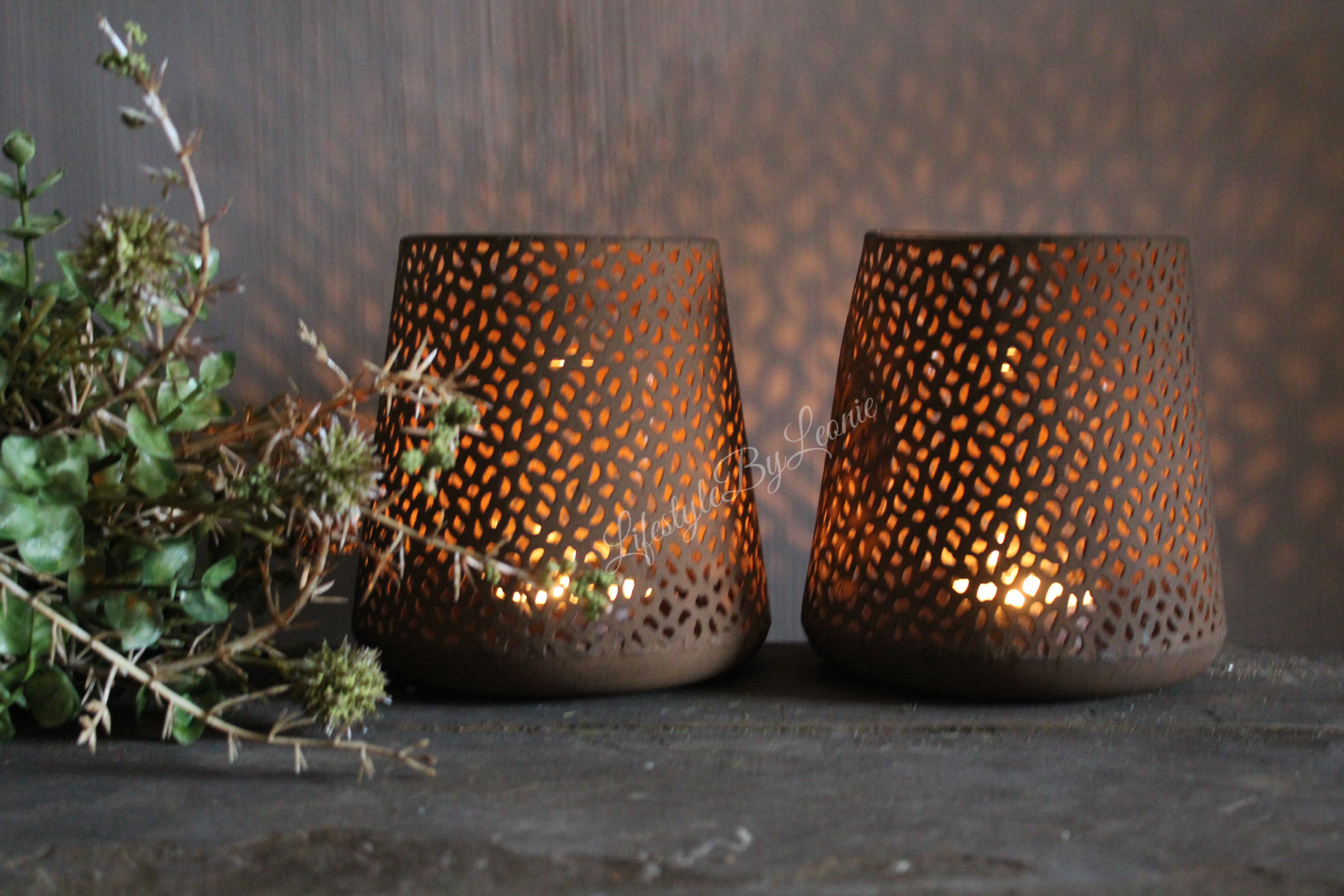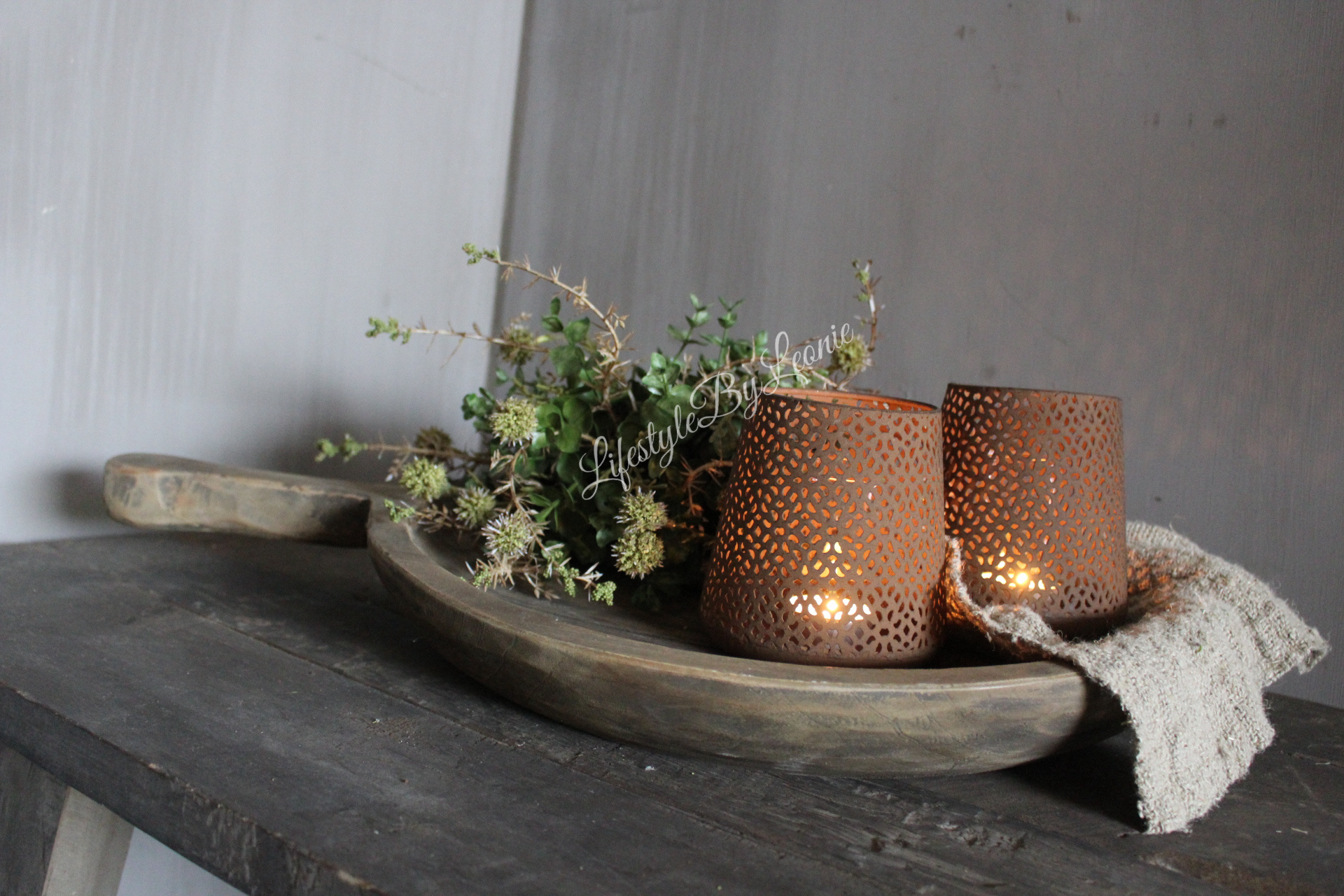 Roestig windlicht met binnenin een glaasje voor een waxinelichtje. Prachtig in een sober landelijk interieur. Deze waxinelichthouder is 12 cm hoog.