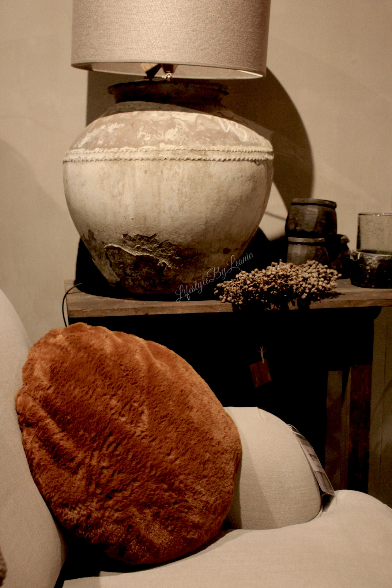Mooi zacht rond bont kussen in een warme bruine kleur. Het kussen heeft een doorsnede van 40 cm.