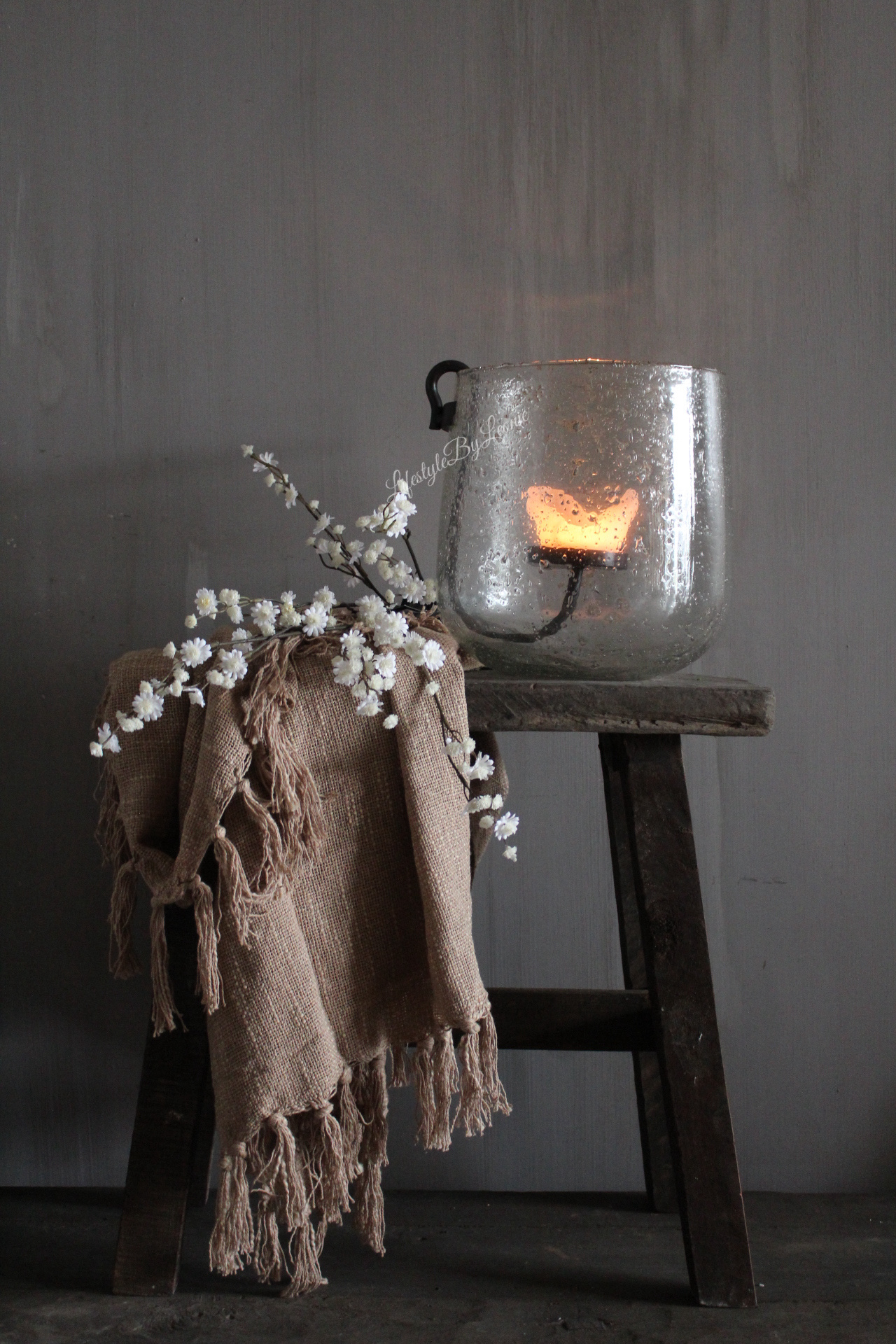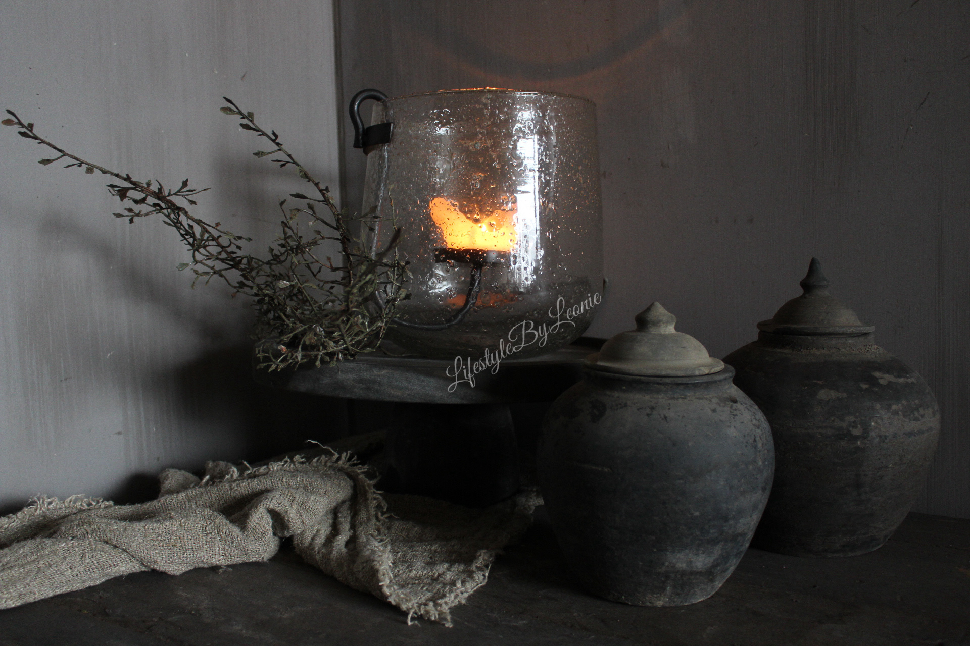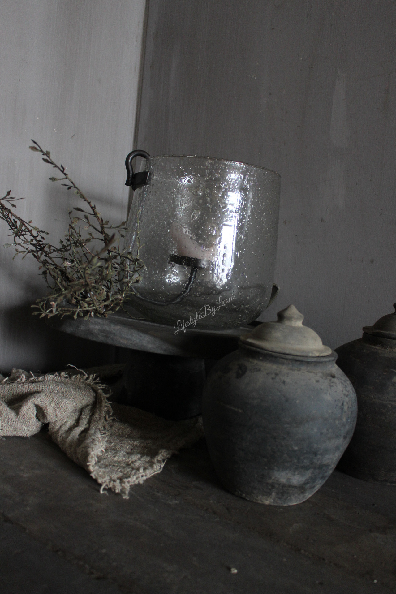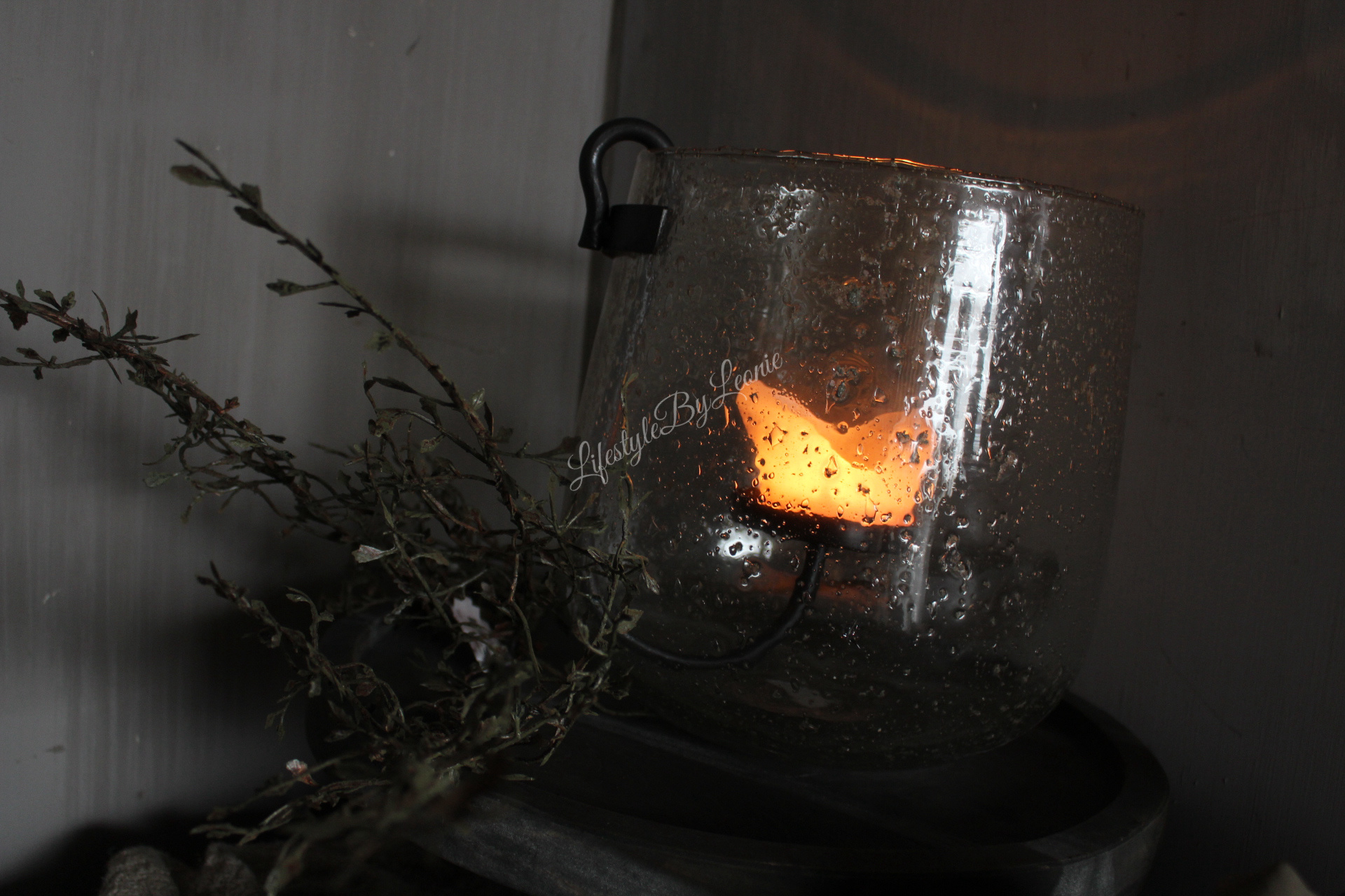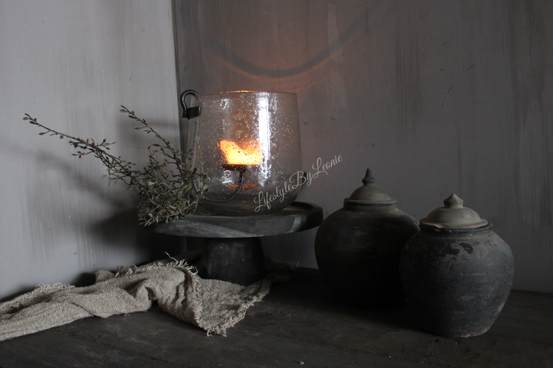 Prachtig groot rond windlicht met bubbels en incl grote S hangkandelaar