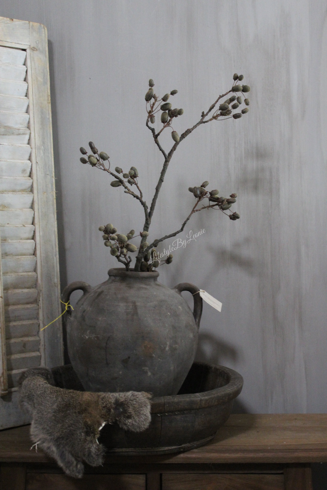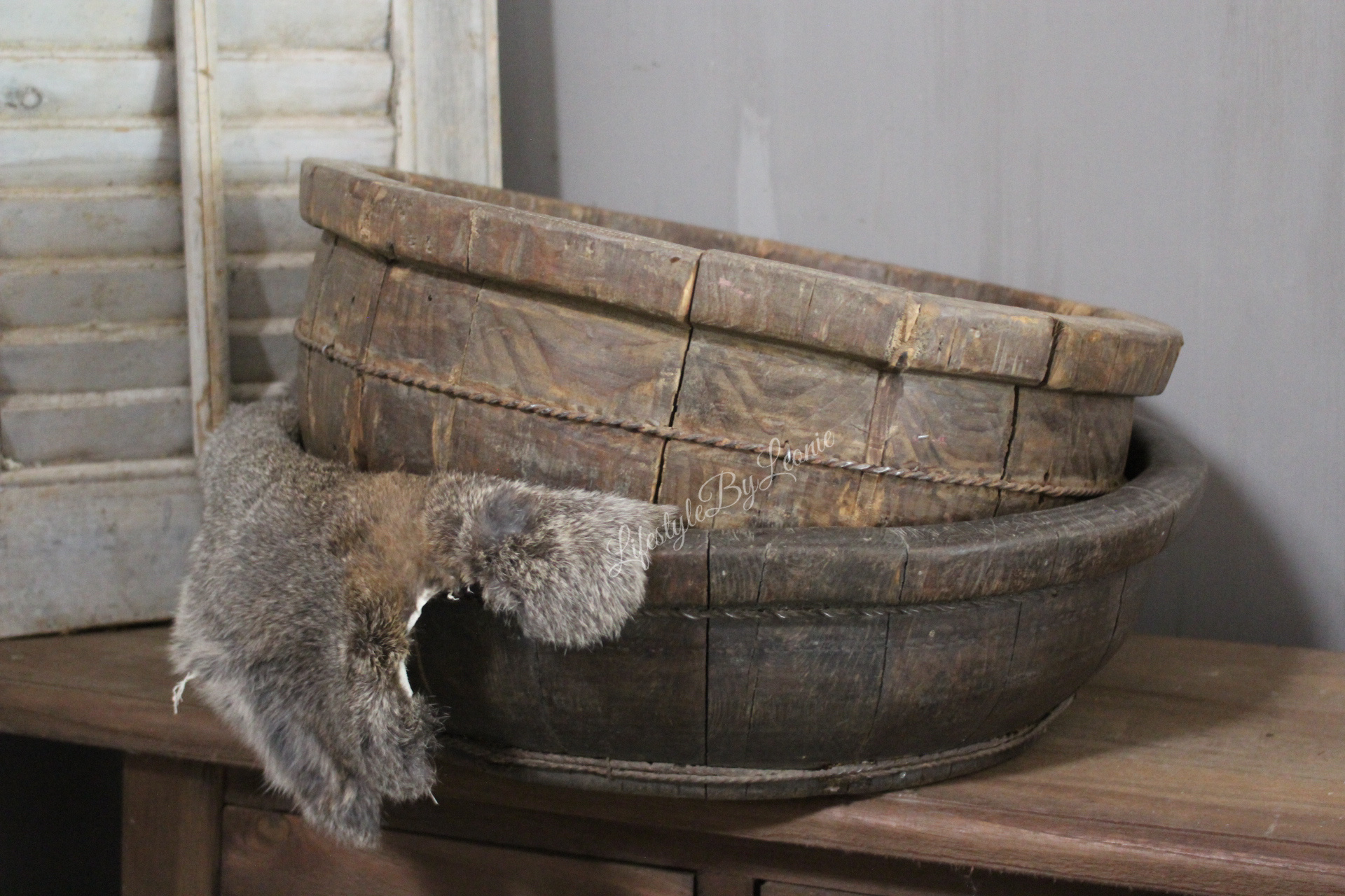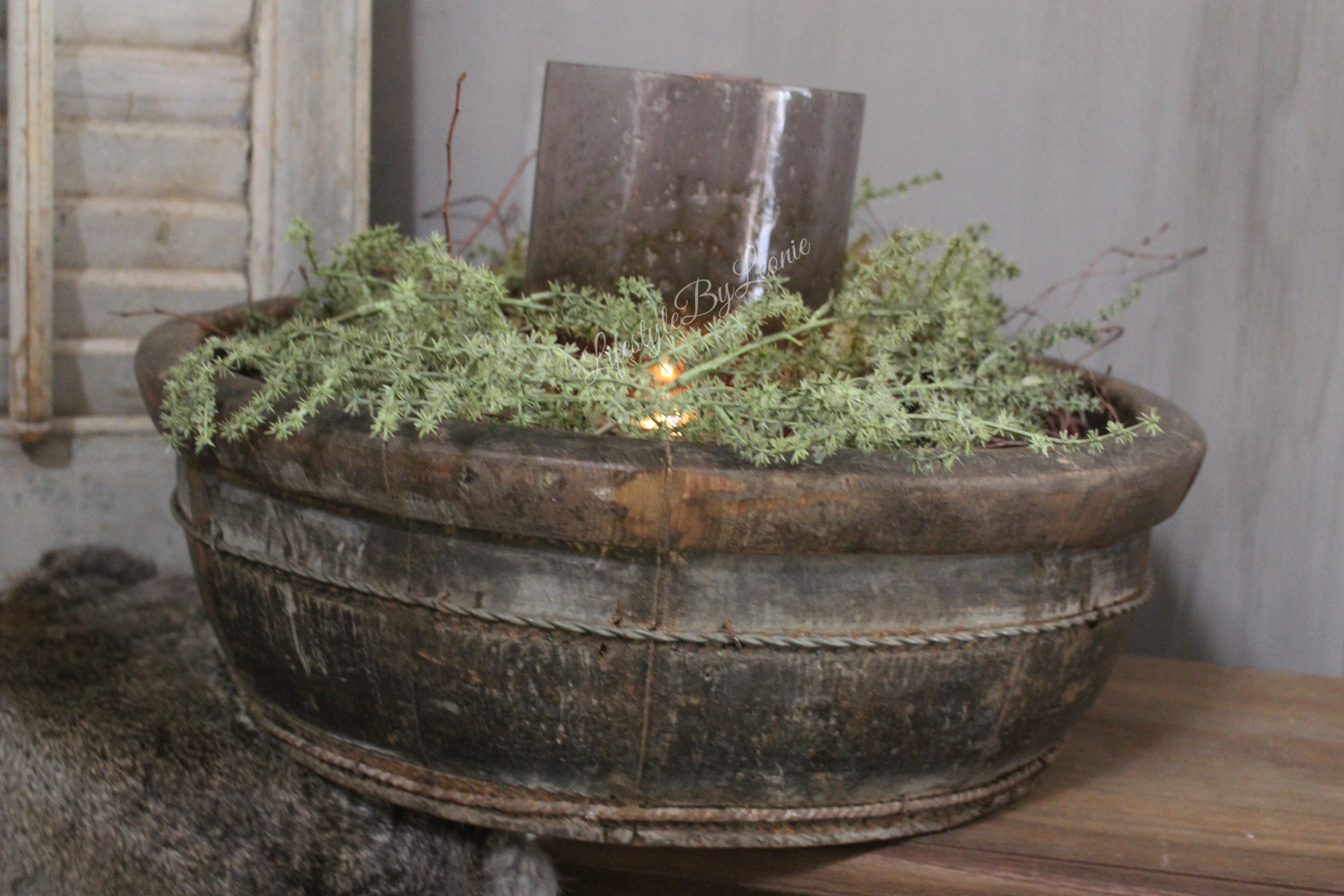 Prachtige unieke oude gebruikte ronde houten olijfbak, in handig formaat voor op een koffietafel of side table. Erg mooi met een oude stenen kruik, of met een toef of een dadeltak en wat kandelaren!