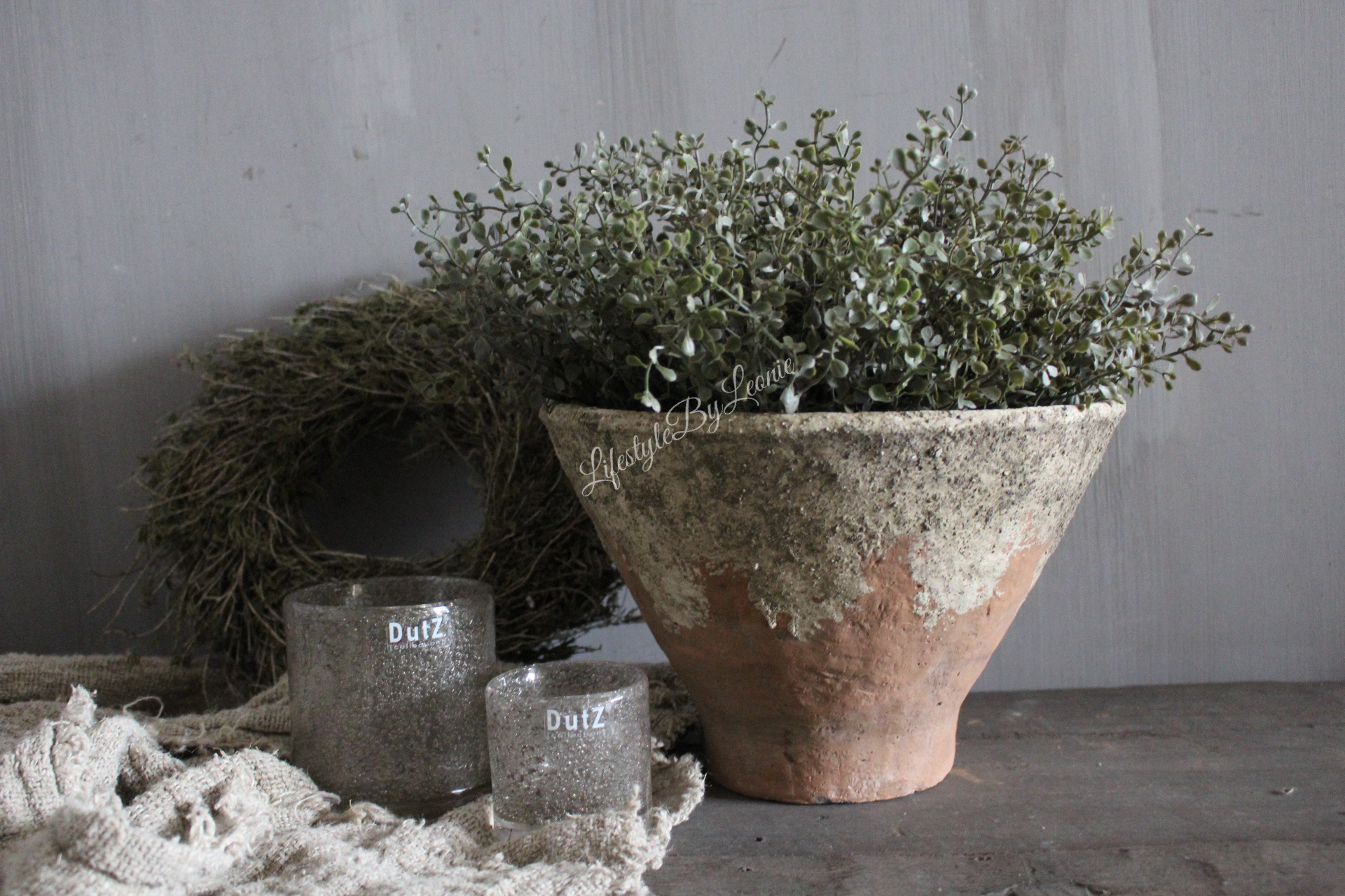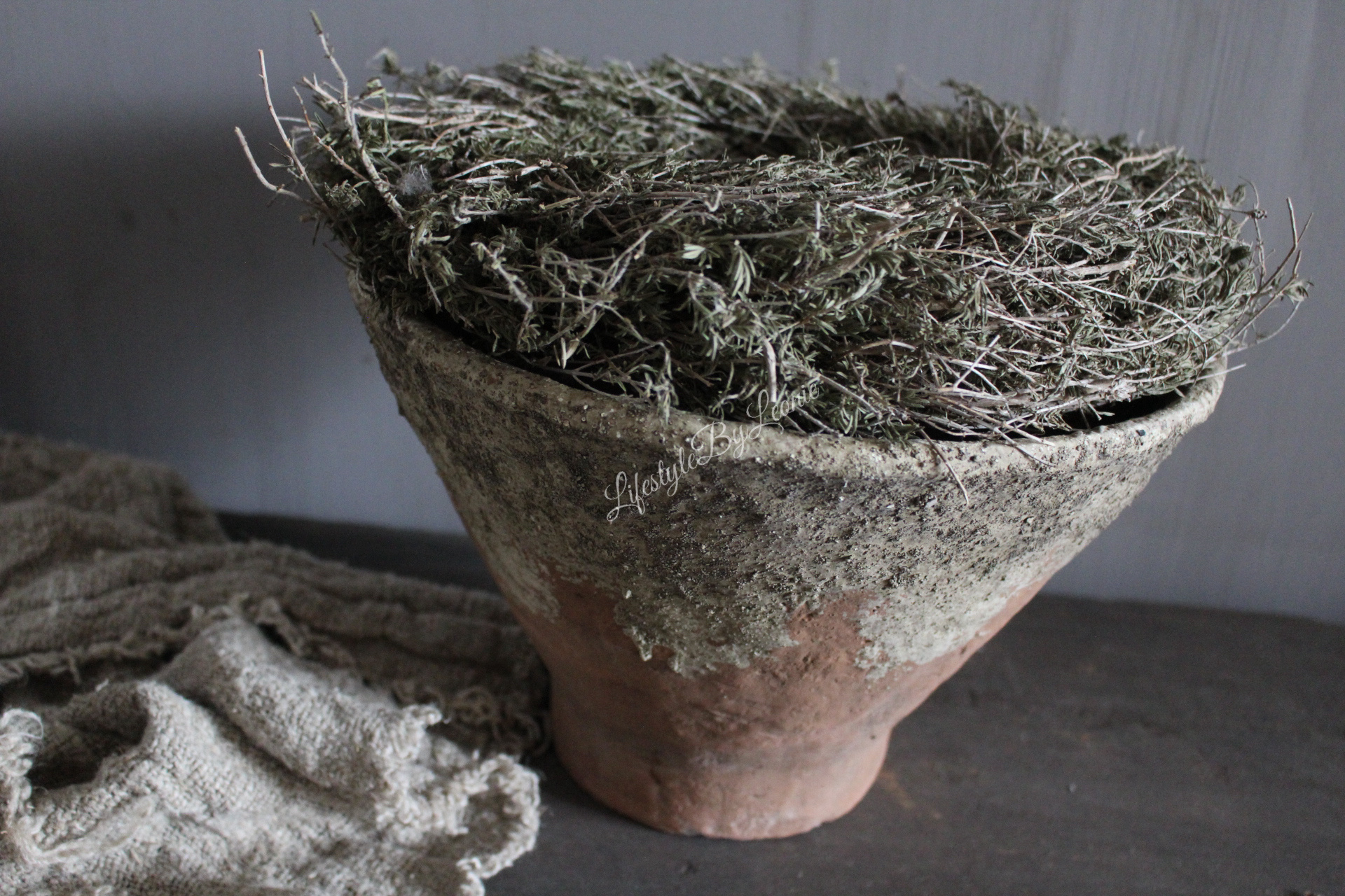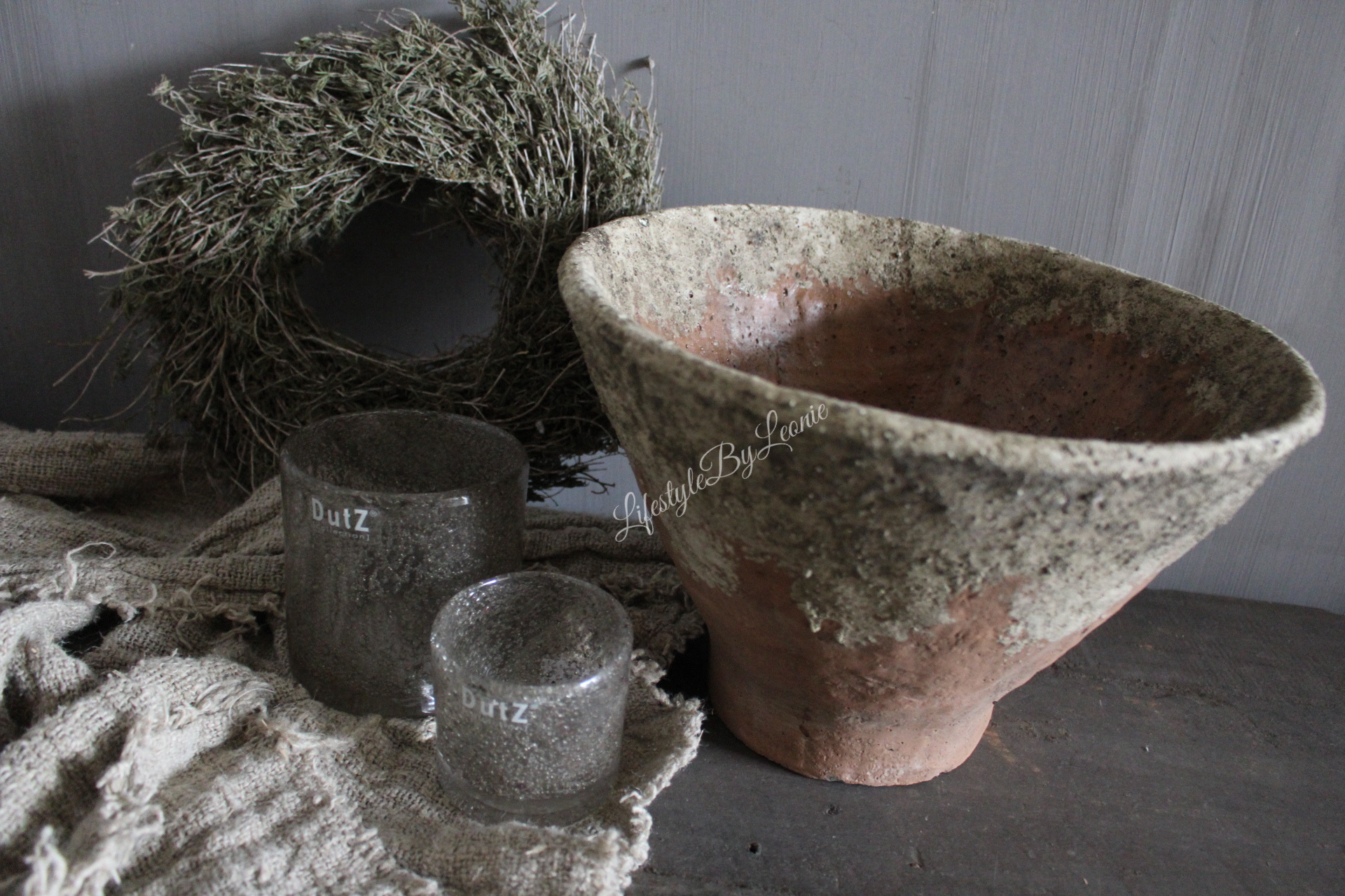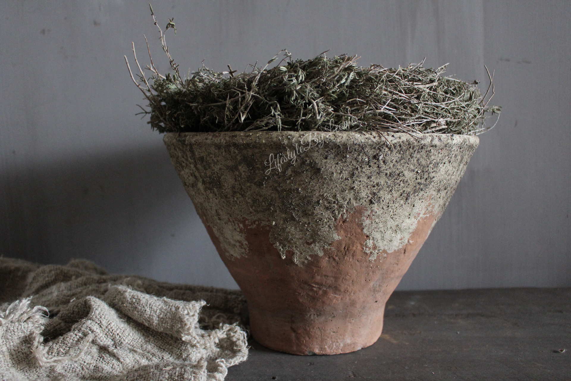 Mooie grote ronde stenen pot met een oud en verweerd uiterlijk.