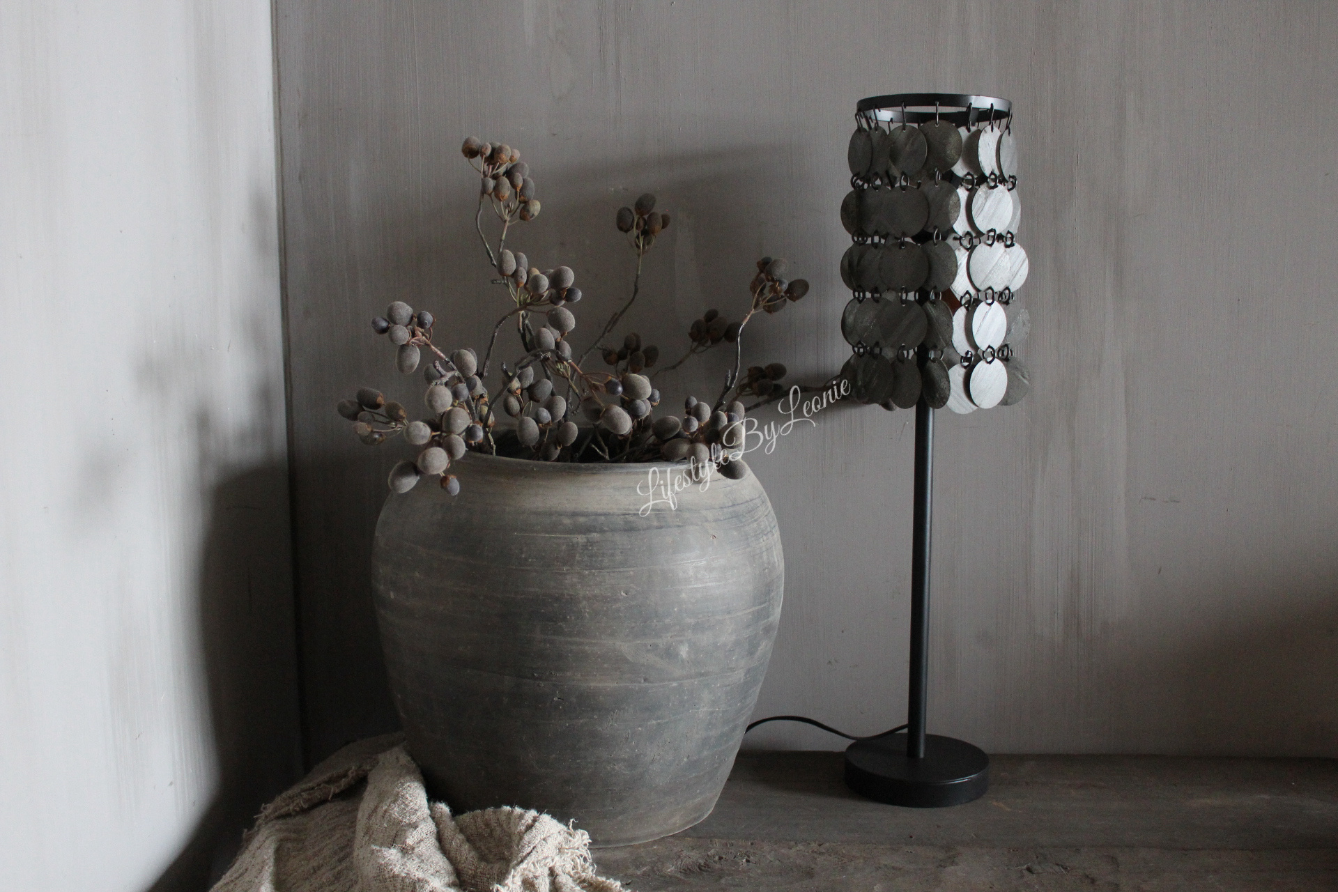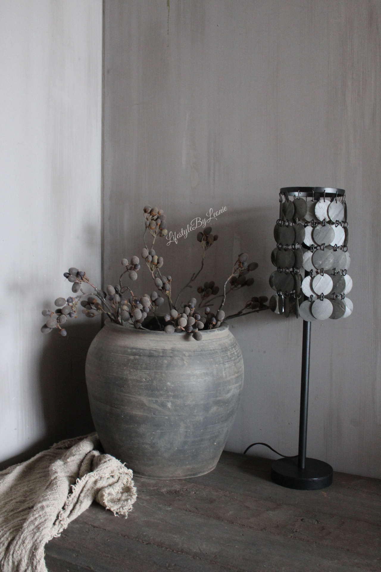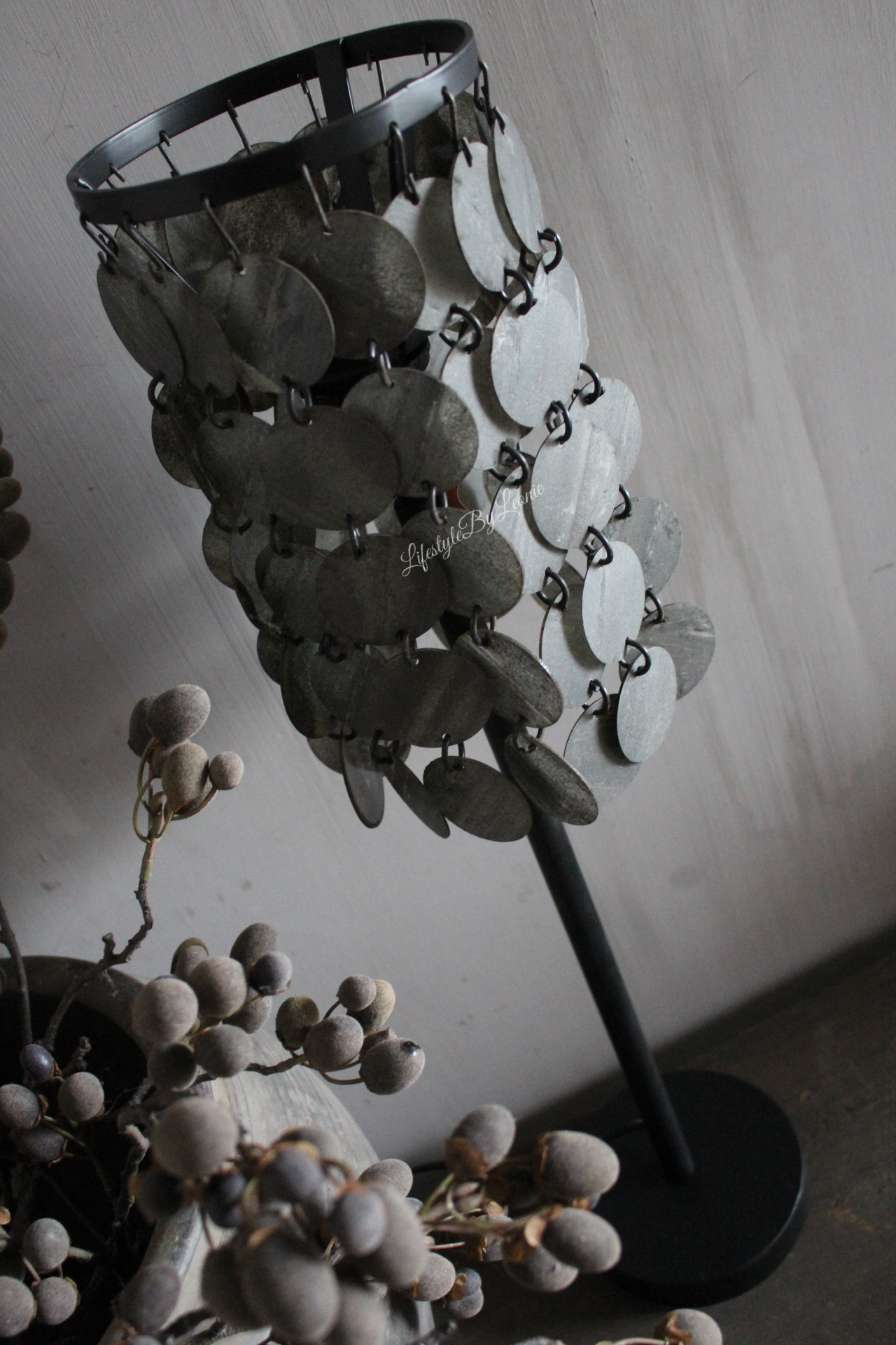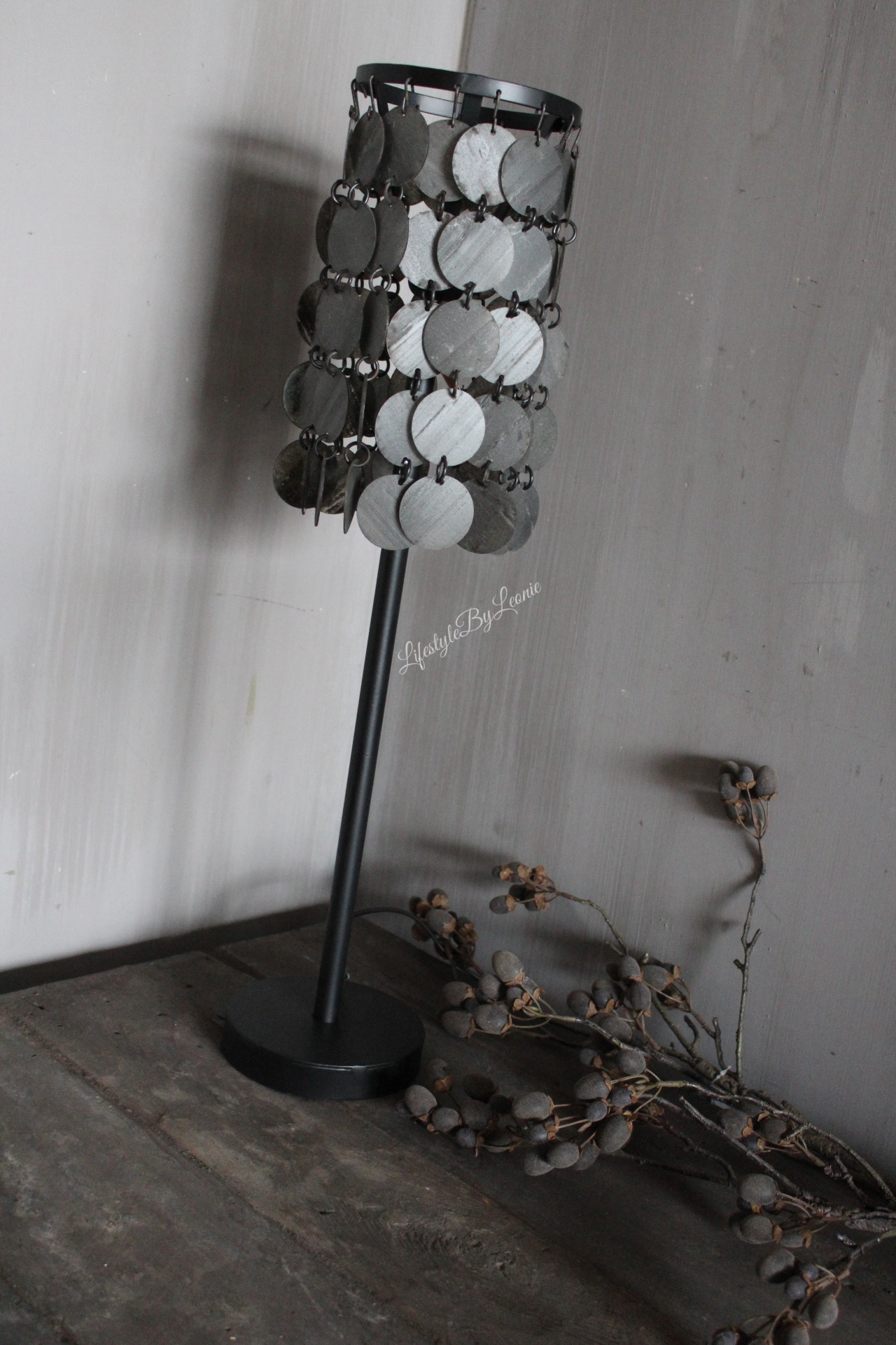 Prachtige eyecatcher van een tafellamp met zwart grijze metalen schijfjes als kap voor een echt wow-effect! De lamp is 70 cm hoog.
