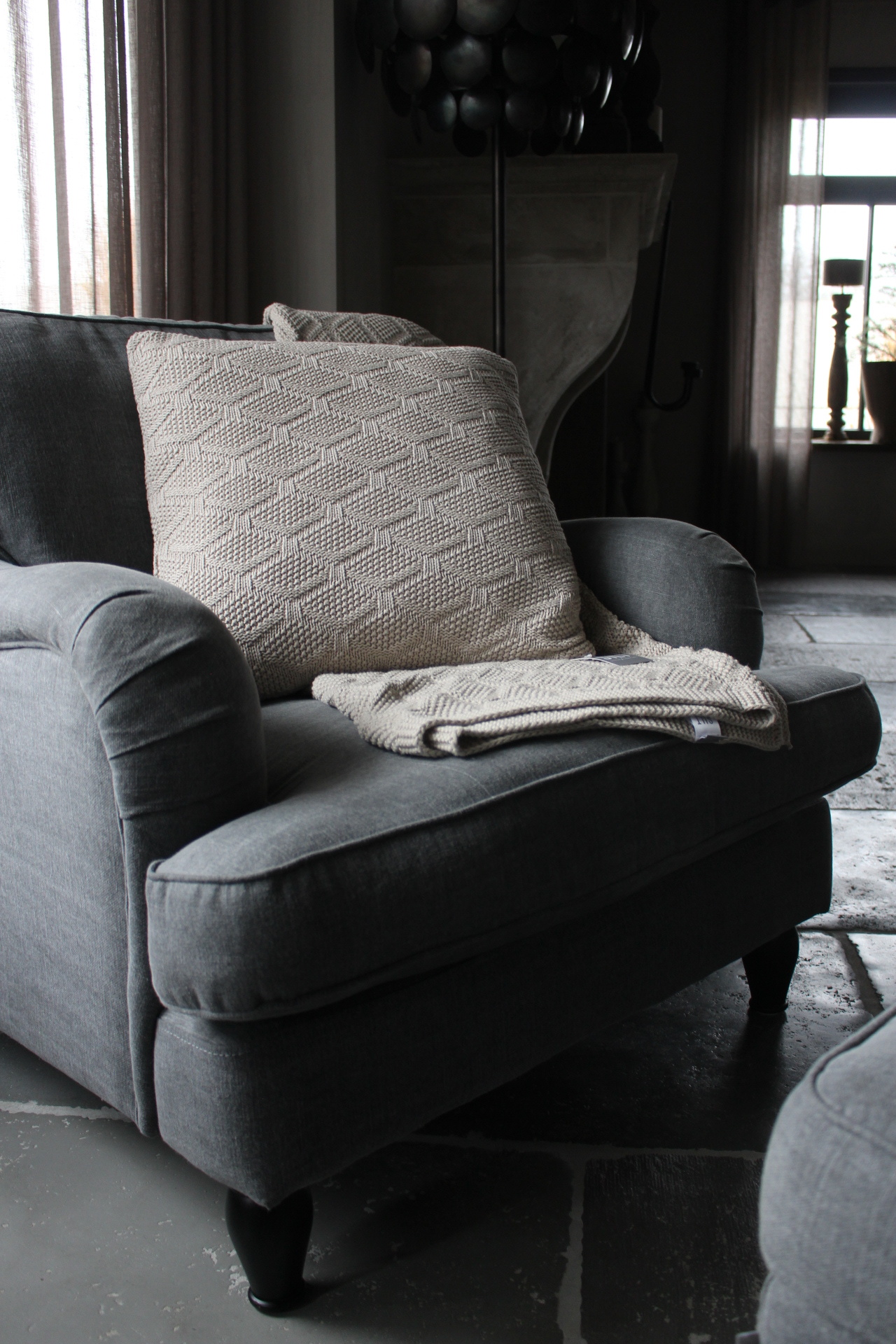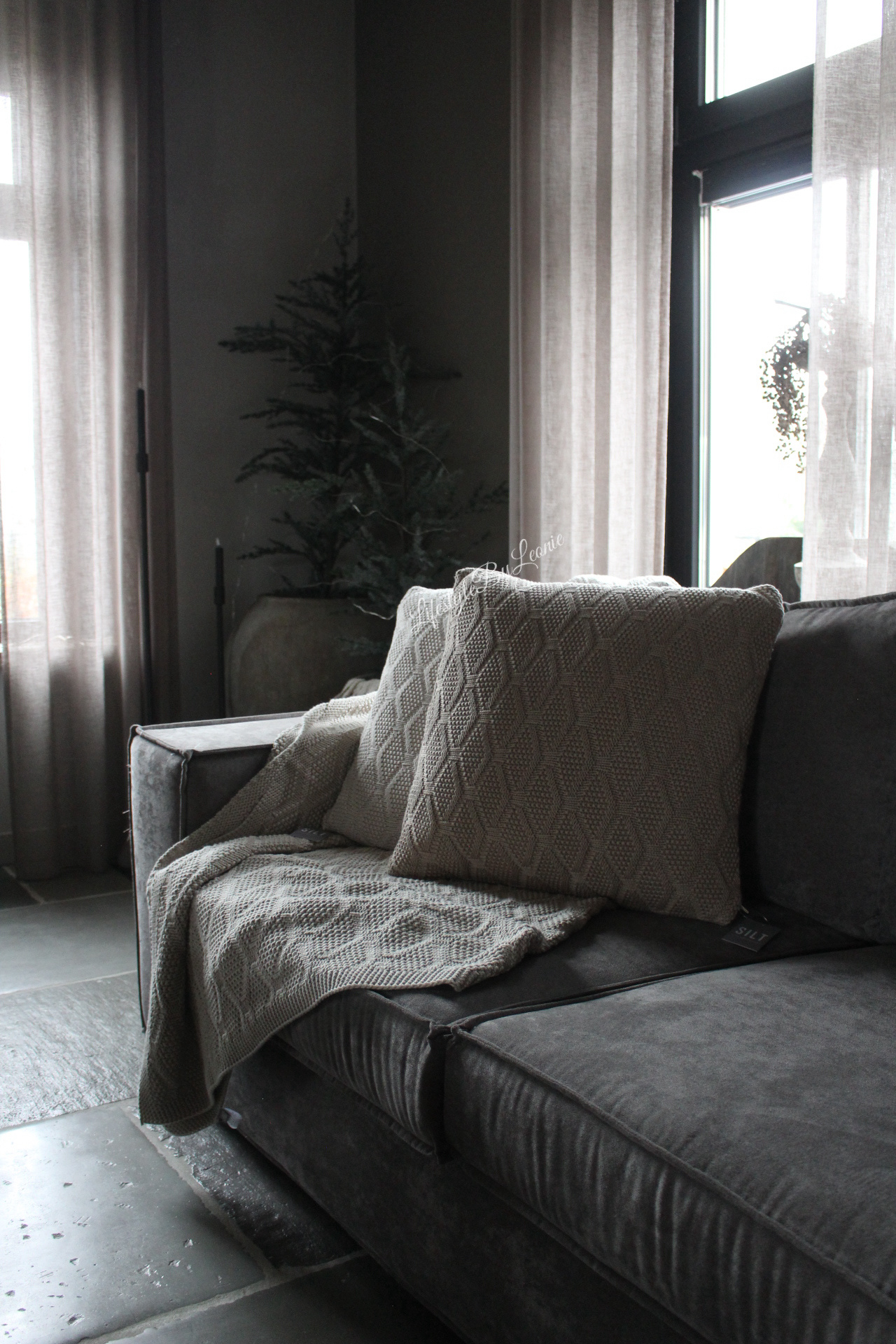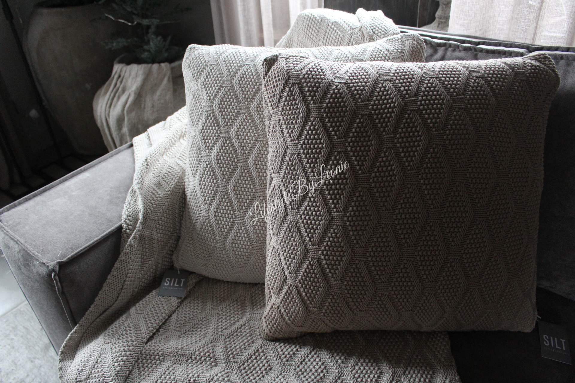 Prachtig gebreid zacht greige (grijs / beige) kussen.