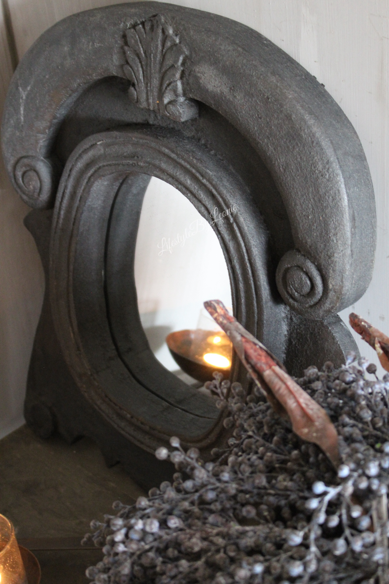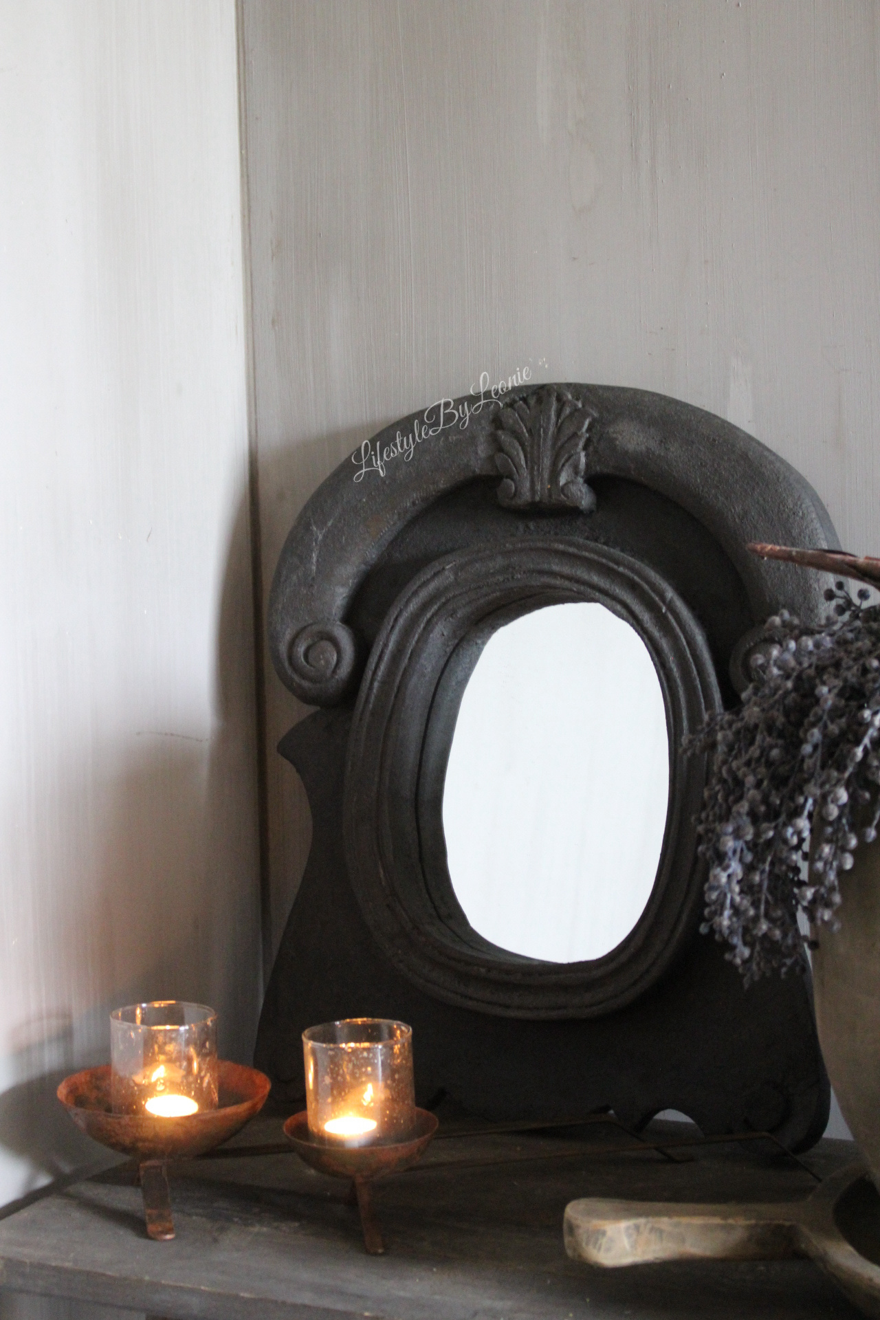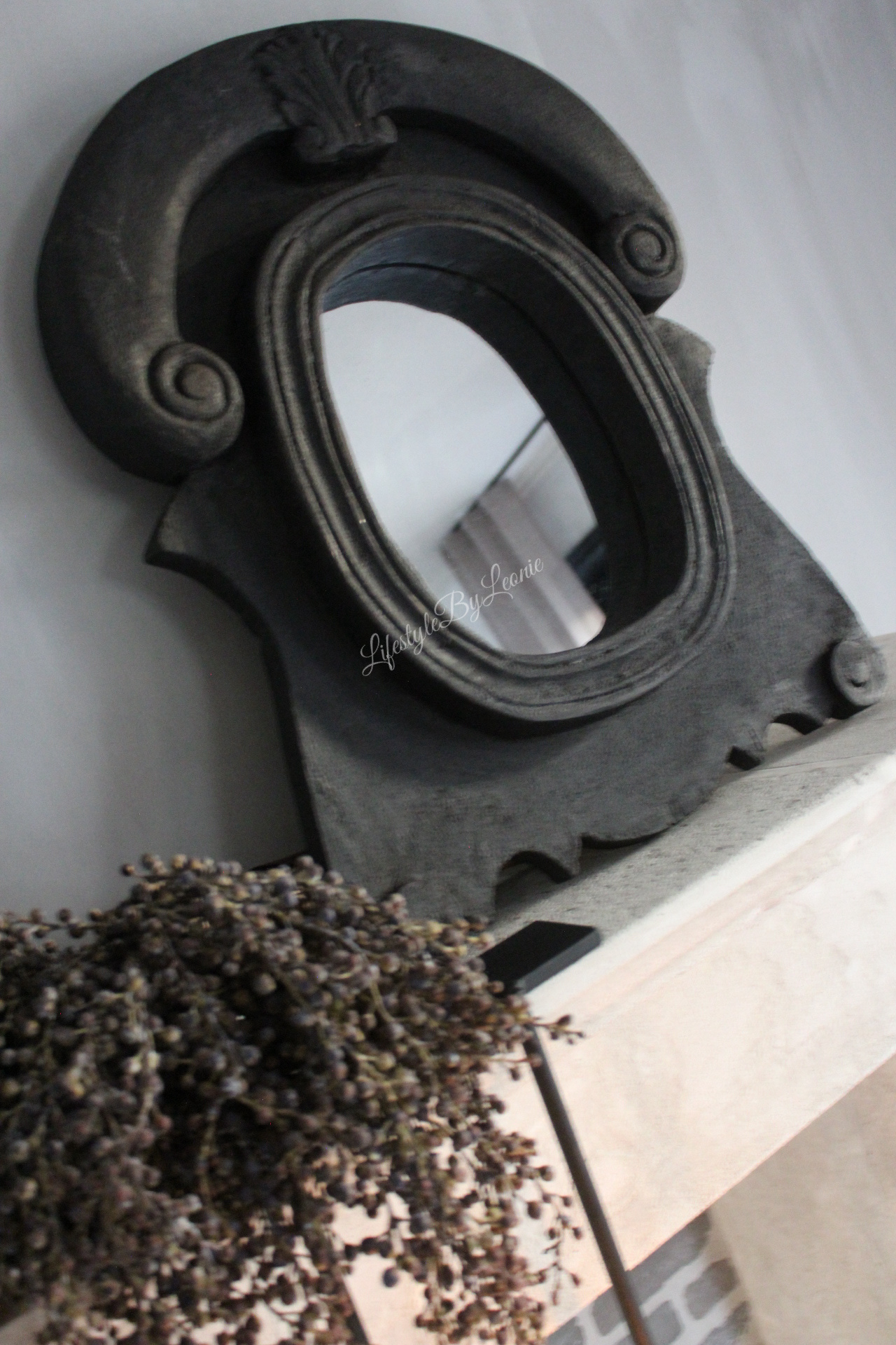 Sobere houten ossenoog spiegel in een donkergrijze kleur. De spiegel is in zwaar materiaal uitgevoerd en wordt opgehangen met twee ophanghaakjes.