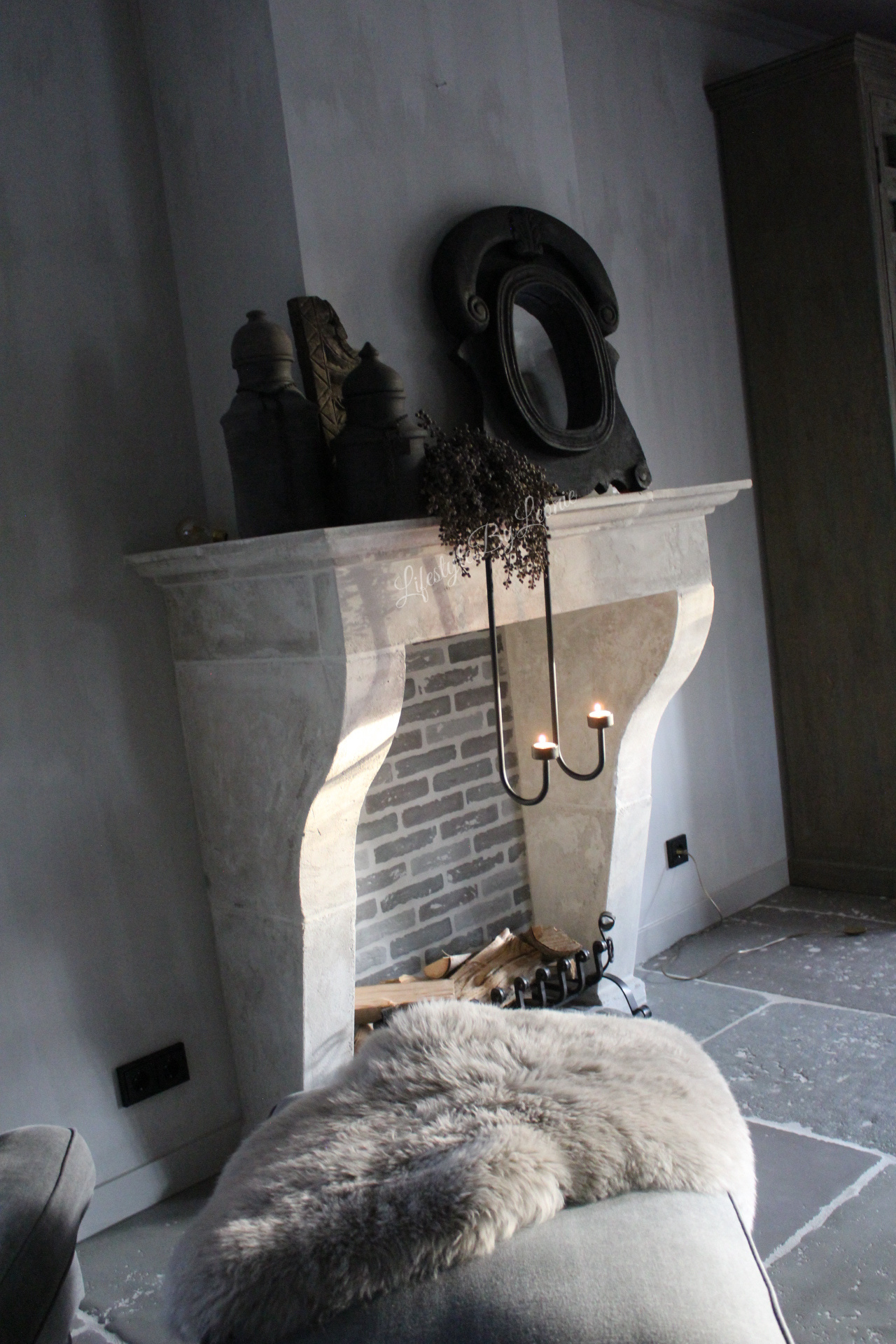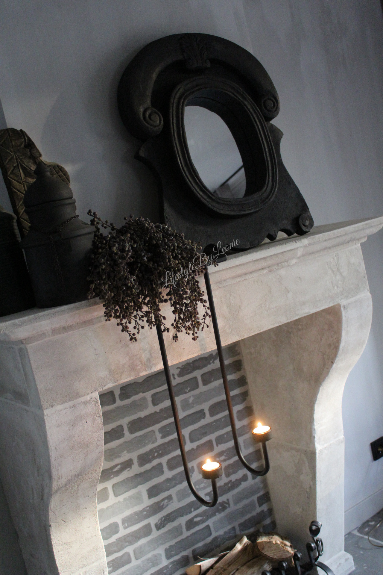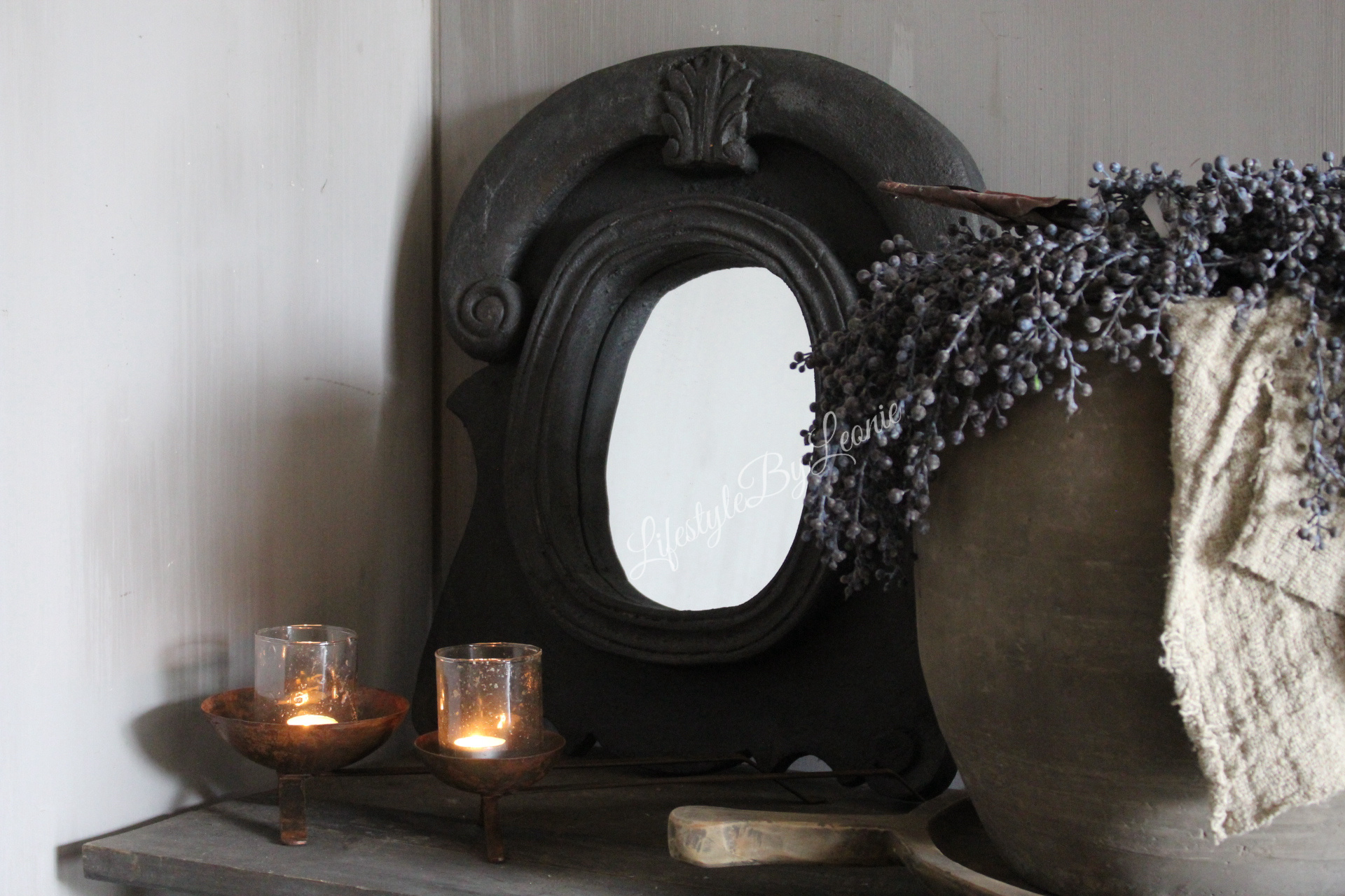 Sobere houten ossenoog spiegel in een donkergrijze kleur. De spiegel is in zwaar materiaal uitgevoerd en wordt opgehangen met twee ophanghaakjes.
