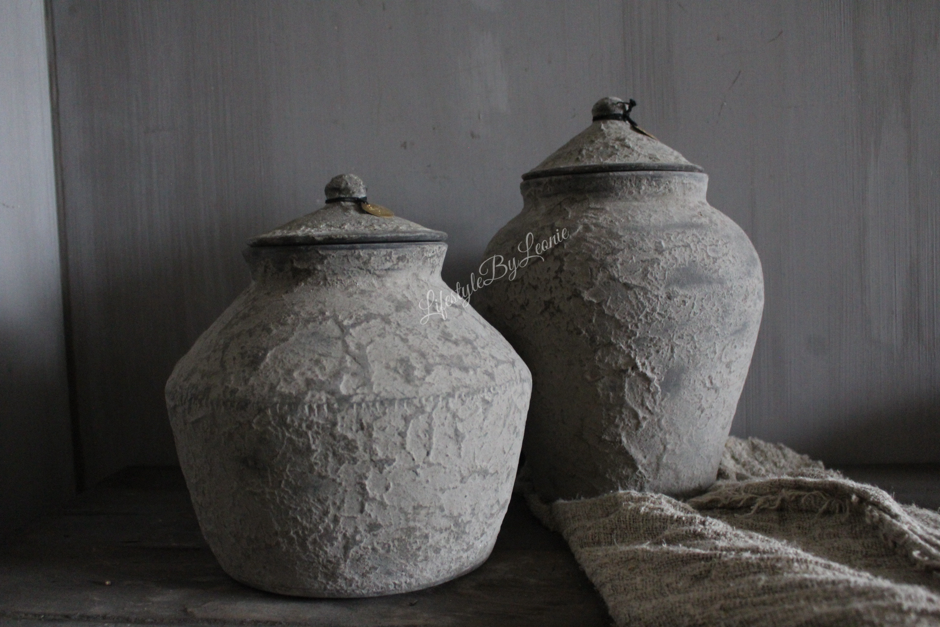 Zware stenen kruik met deksel. De kruik is 30 cm hoog. Leuk om op een tafeltje of kastje te zetten.
