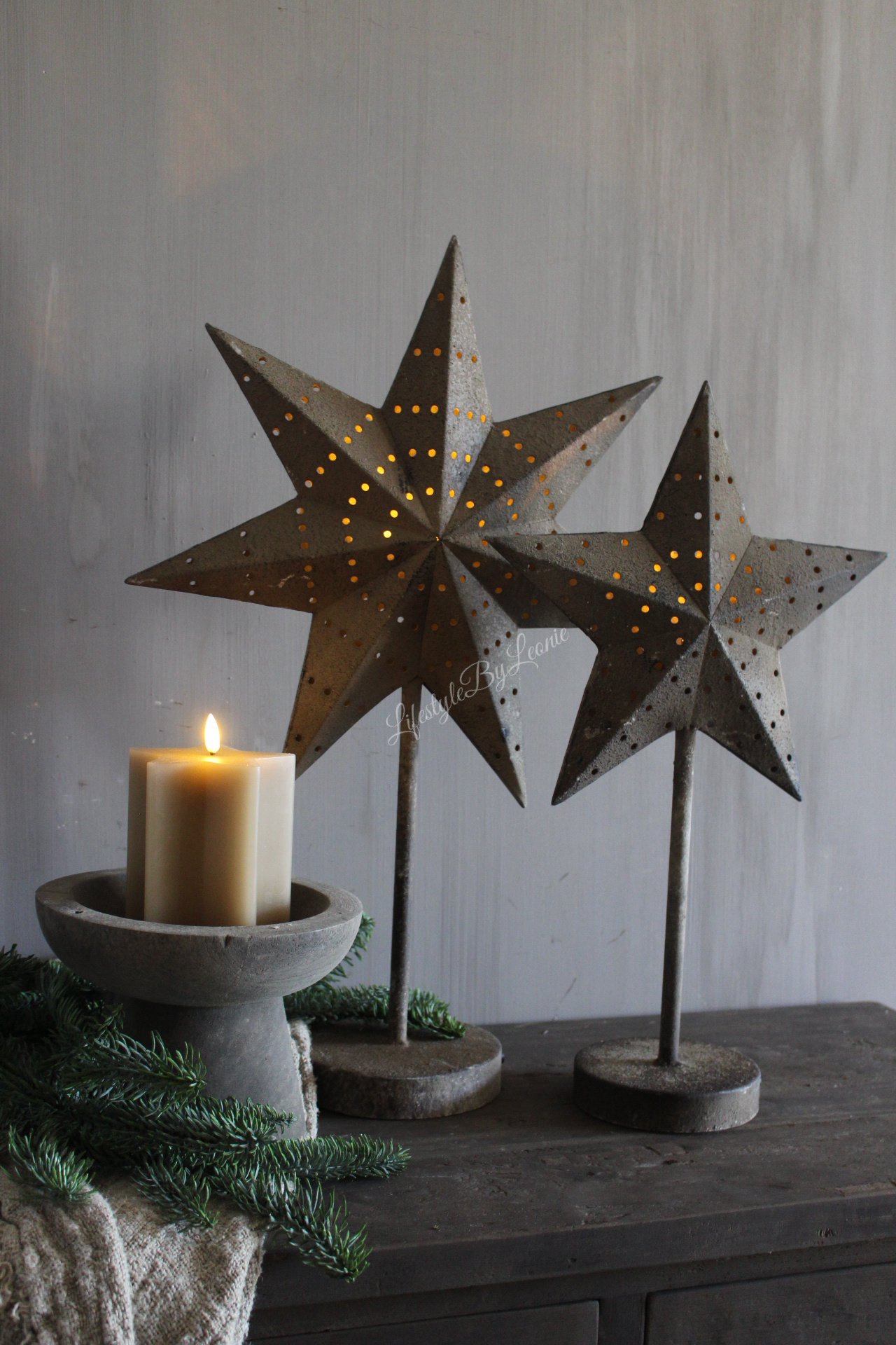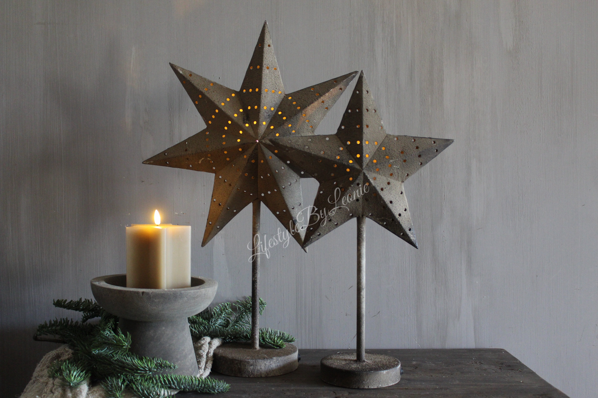 Prachtige metalen ster op voet met gezellige LED lampjes. De ster heeft een mooie warme taupe kleur en is 60 cm groot.