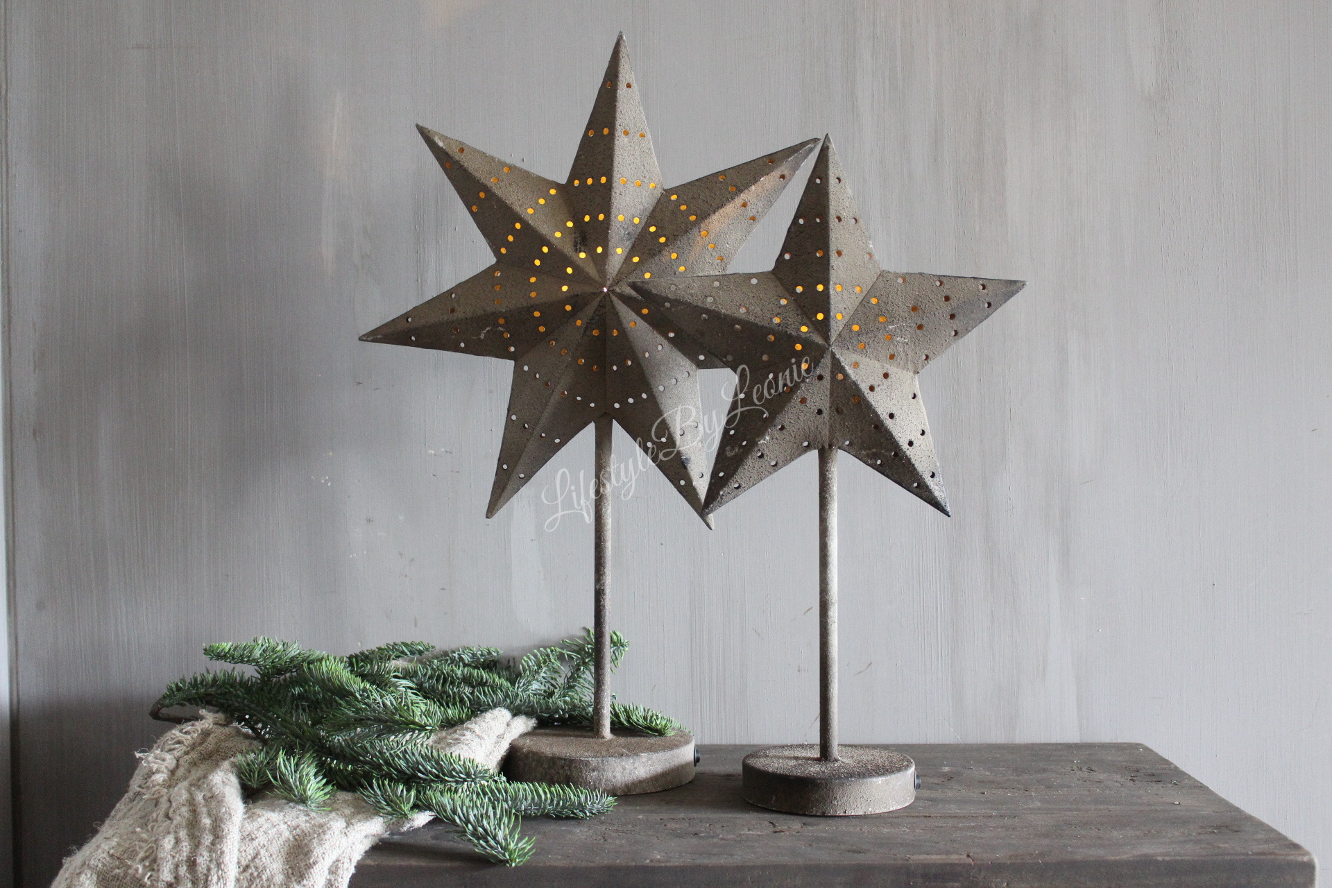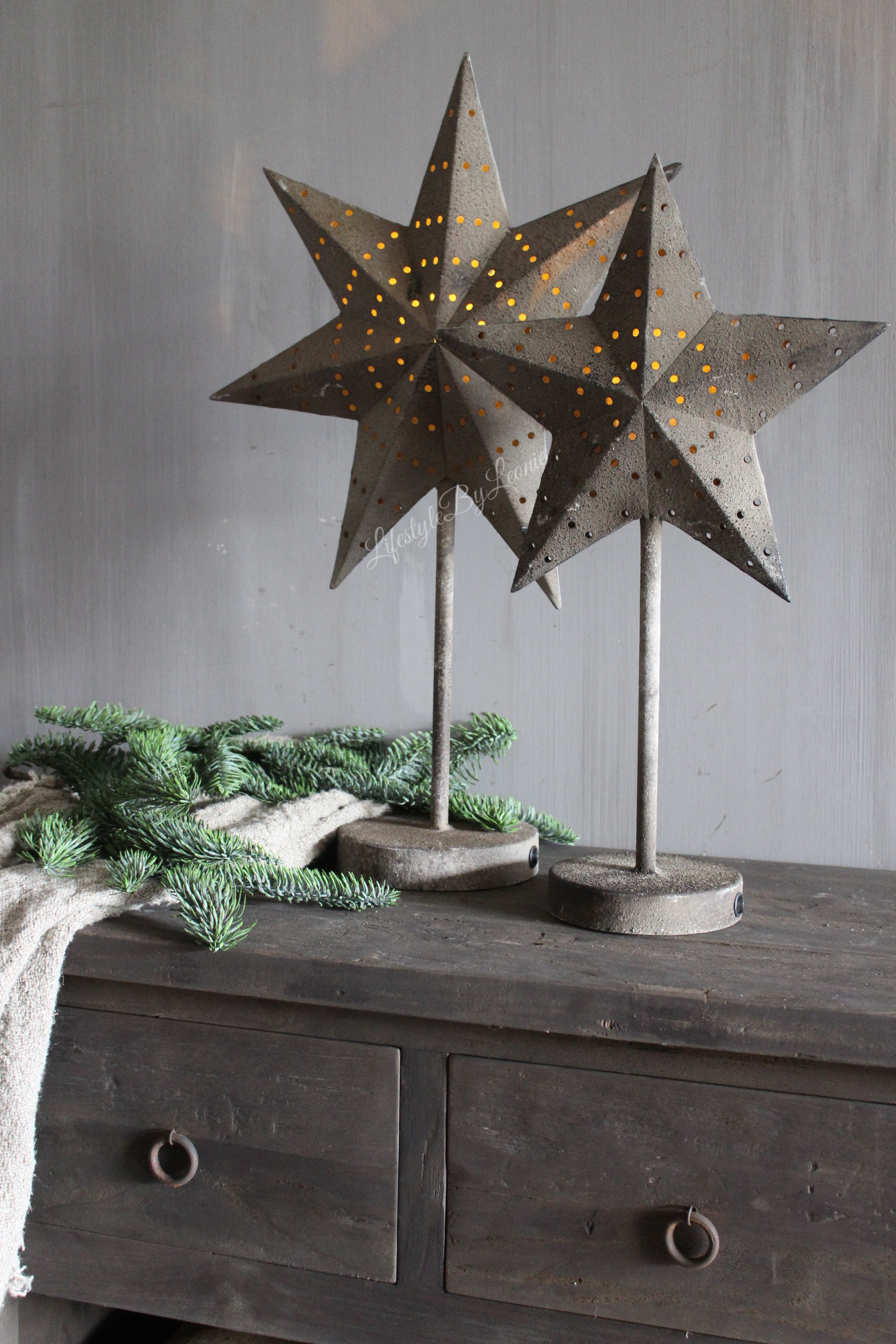 Prachtige metalen ster op voet met gezellige LED lampjes. De ster heeft een mooie warme taupe kleur en is 50 cm groot.