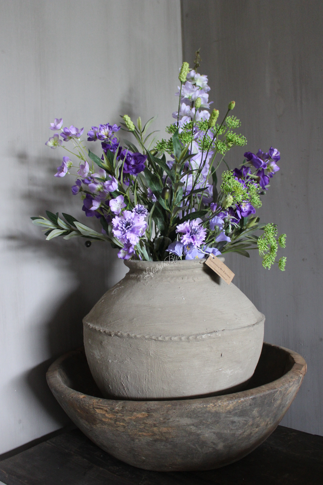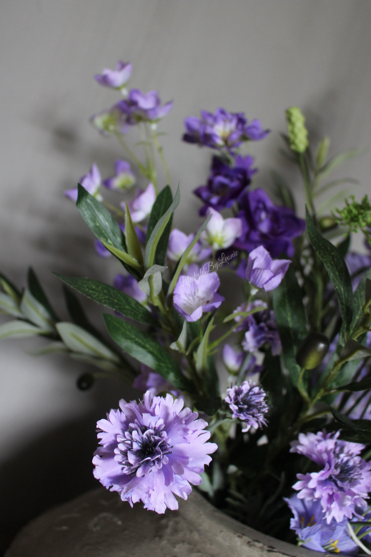 Vrolijk zomers boeket met zijden kunstbloemen. Dit prachtige boeket bevat diverse veldbloemen in paarse en groene tinten. Perfect voor een landelijke sfeer.
