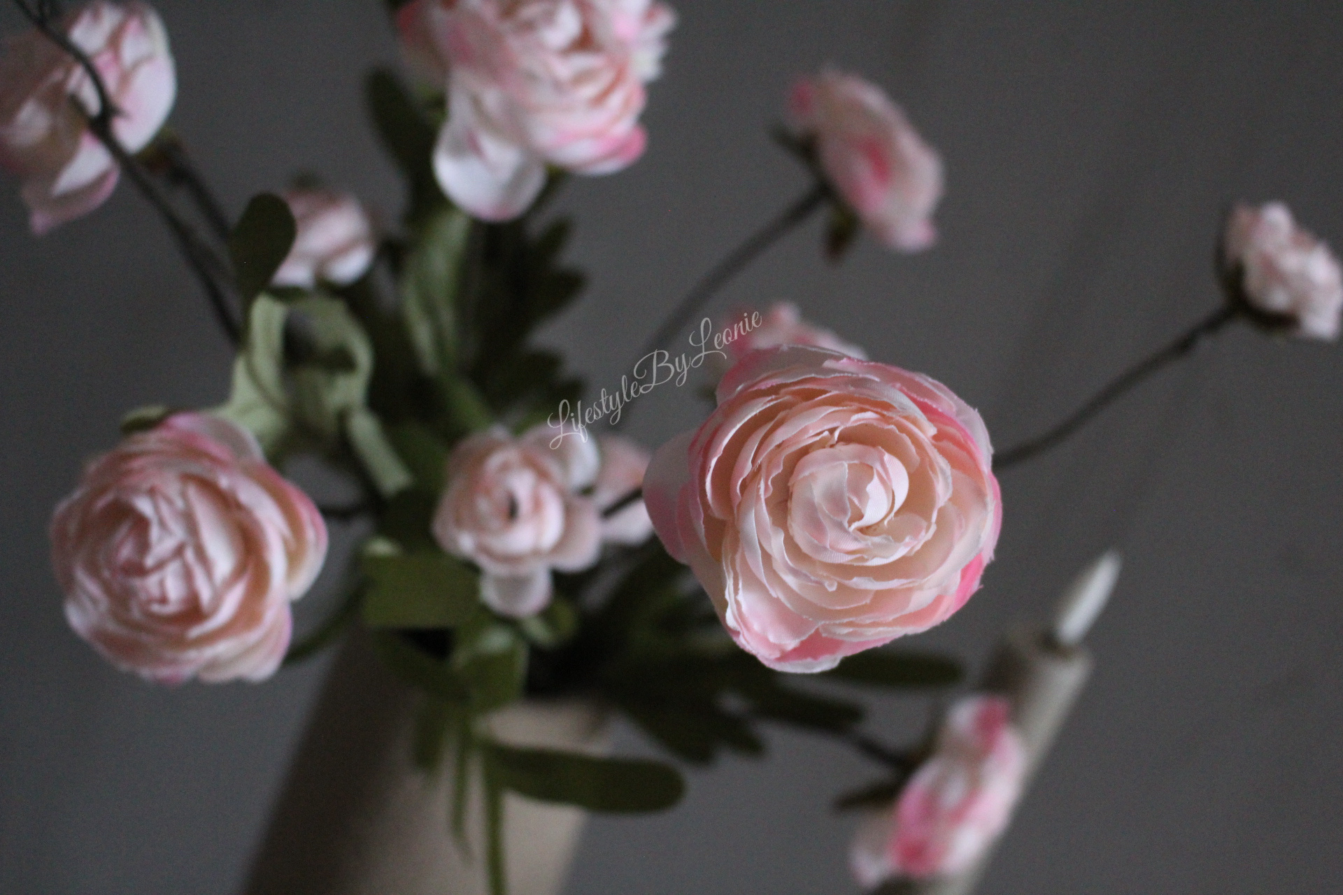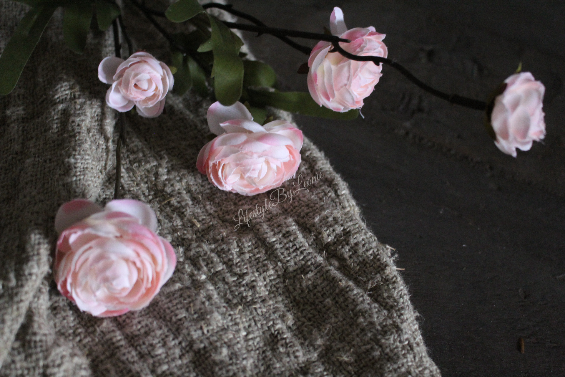 Altijd mooi en vrolijk deze prachtige zijden kunst Ranonkel met pastel roze bloemen. De tak is 52 cm lang.