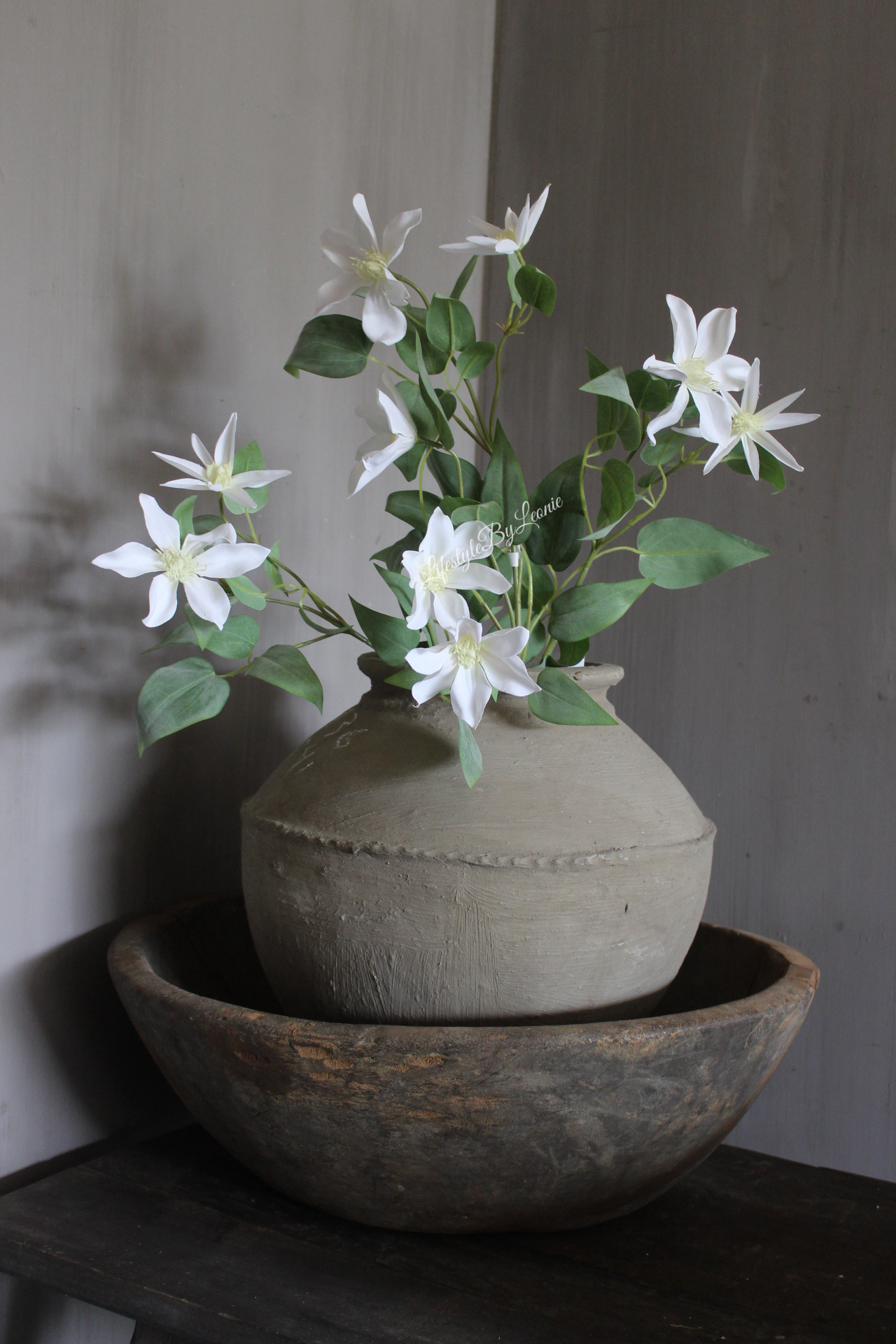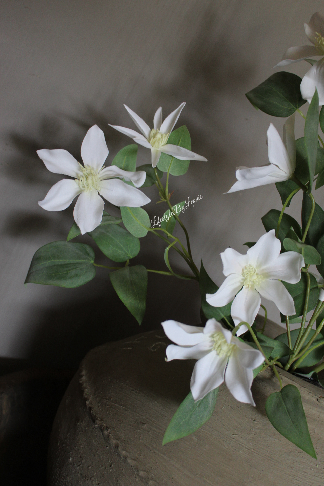 Prachtige zijden Clematis kunsttak met frisse witte bloemen. Deze 86 cm lange tak past perfect in een landelijk interieur.