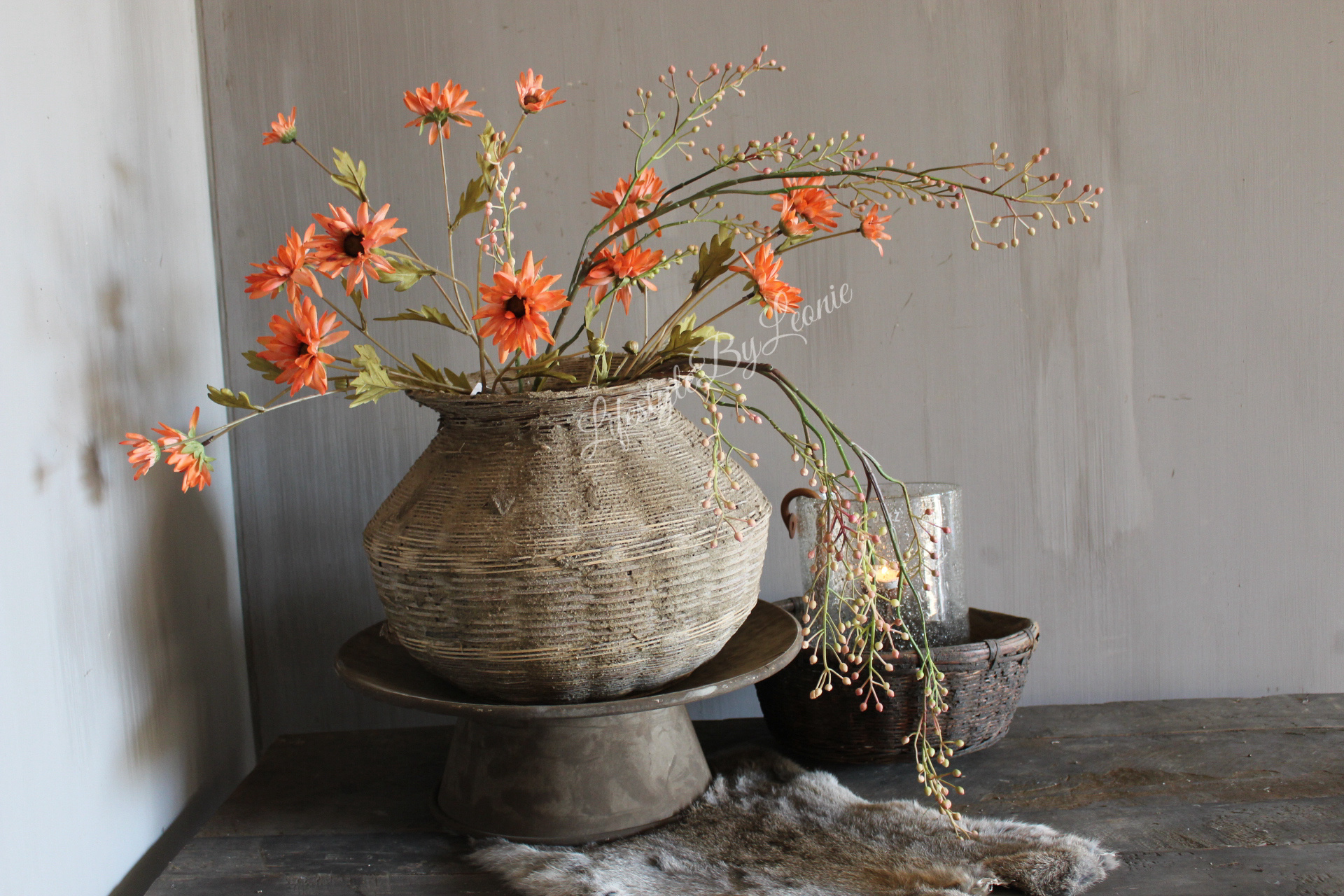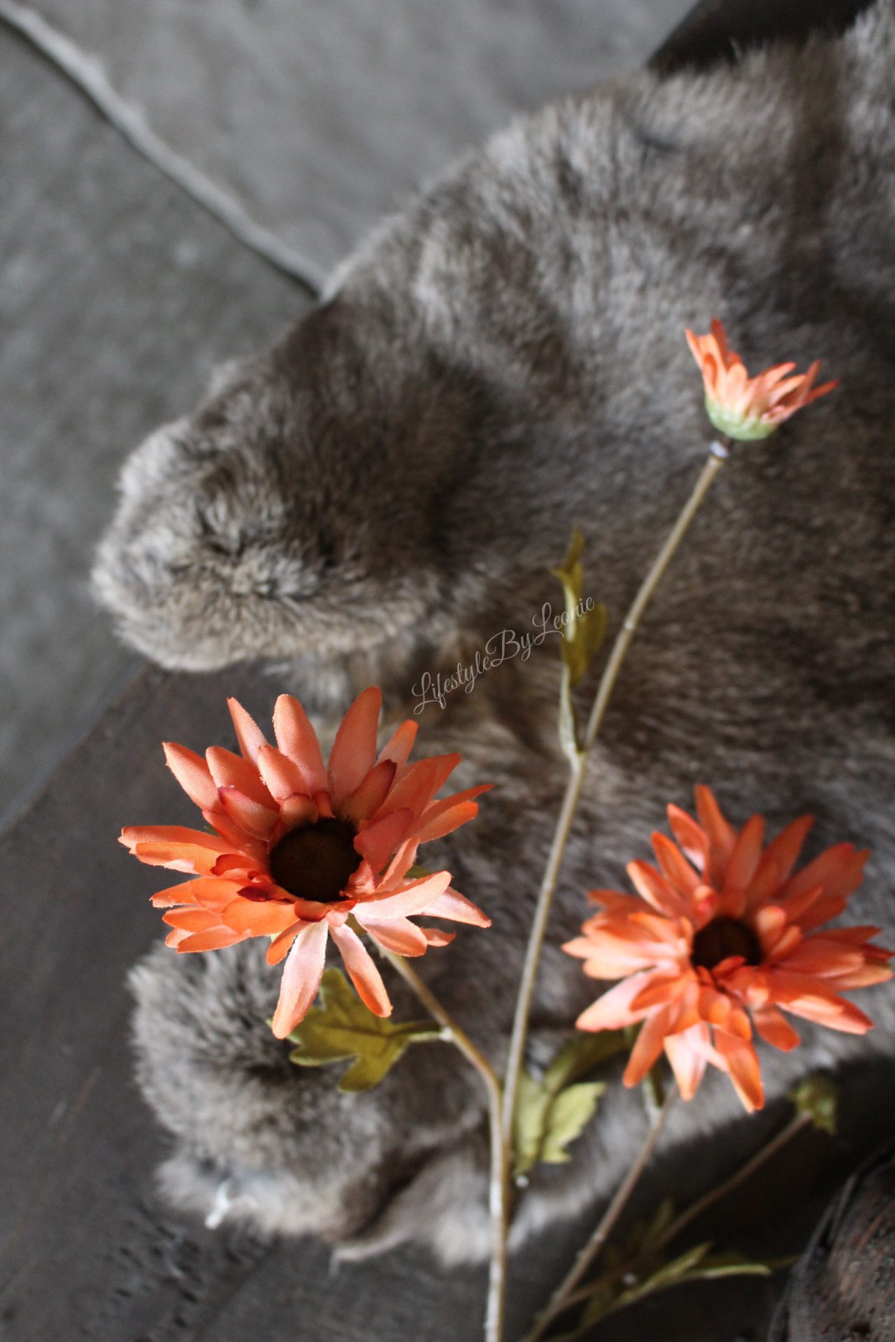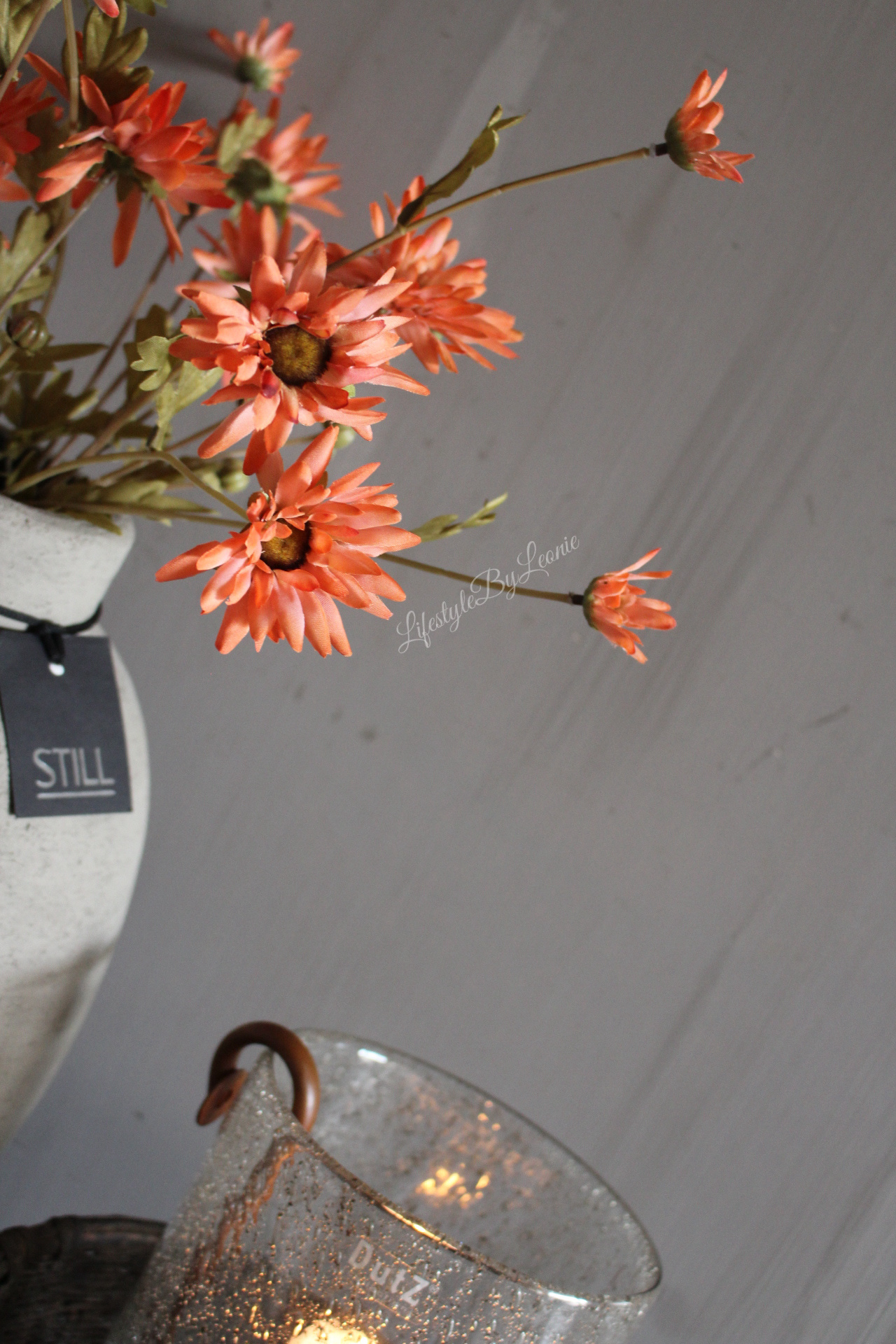 Mooie zijden kunsttak met herfstbloemen in een warme oranje kleur. Mooi om te verwerken in een herfstboeket.
