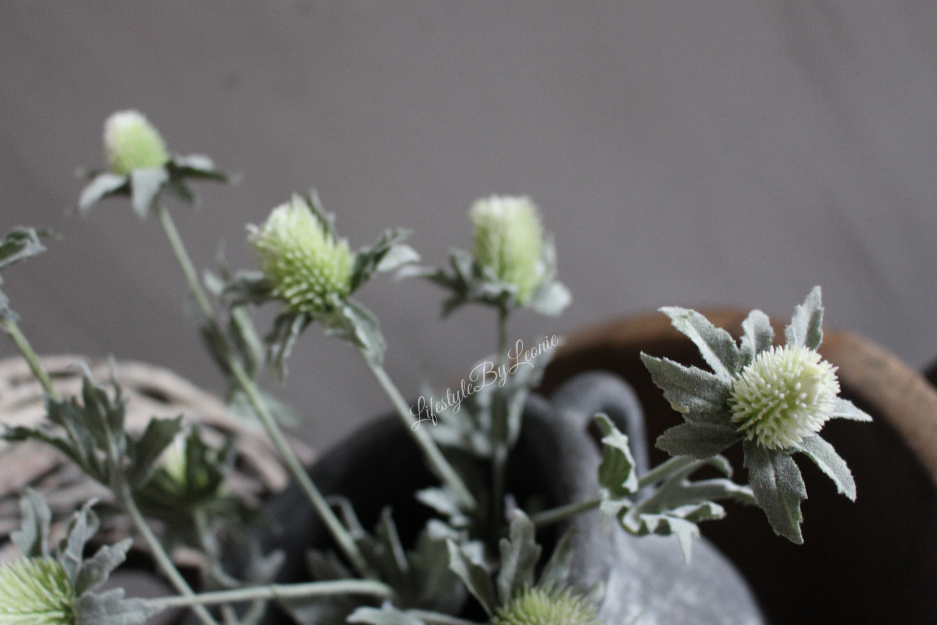 Mooie zijden Distel kunsttak met wit groene bloemen. Deze tak van 40 cm lengte staat erg leuk in een toef of boeket met kunstbloemen.