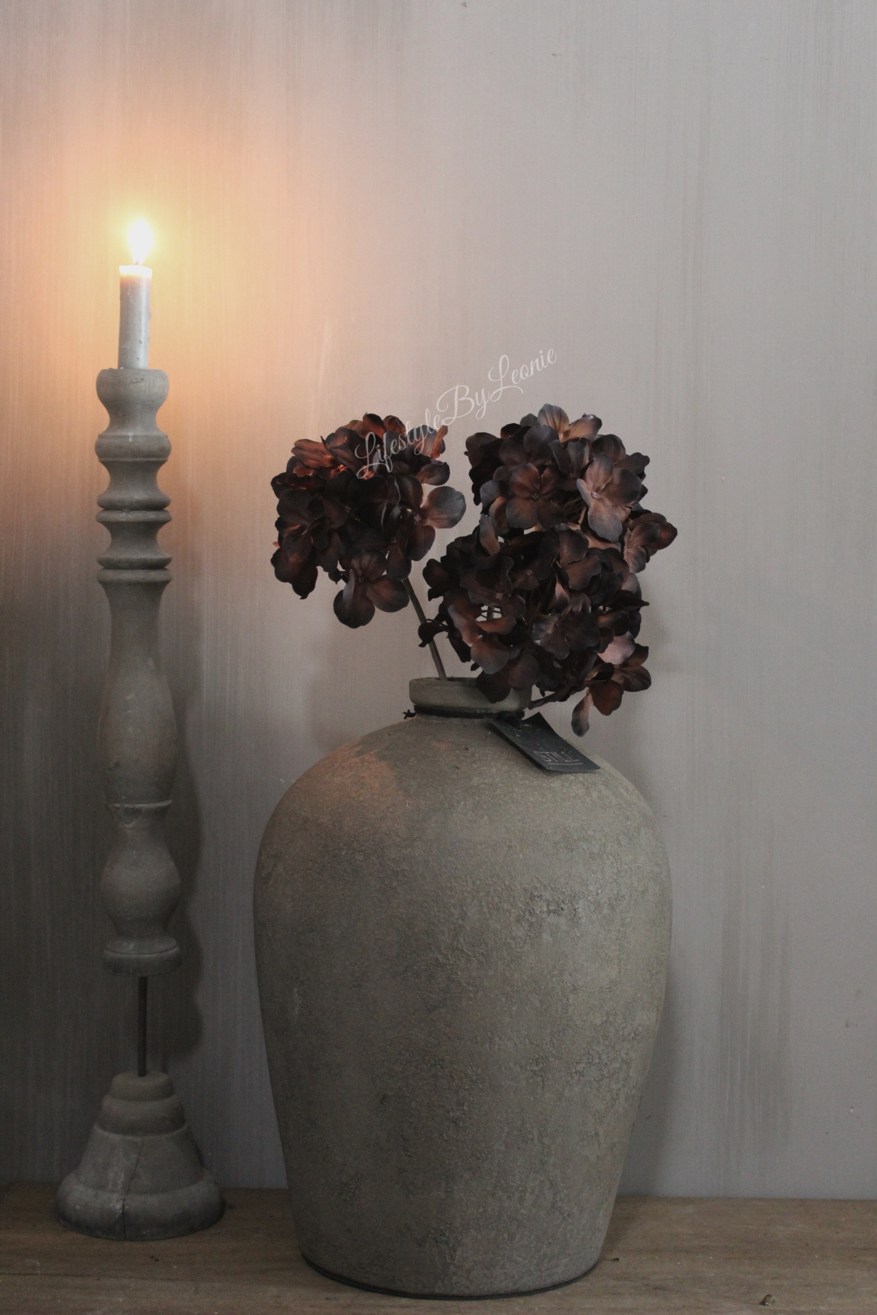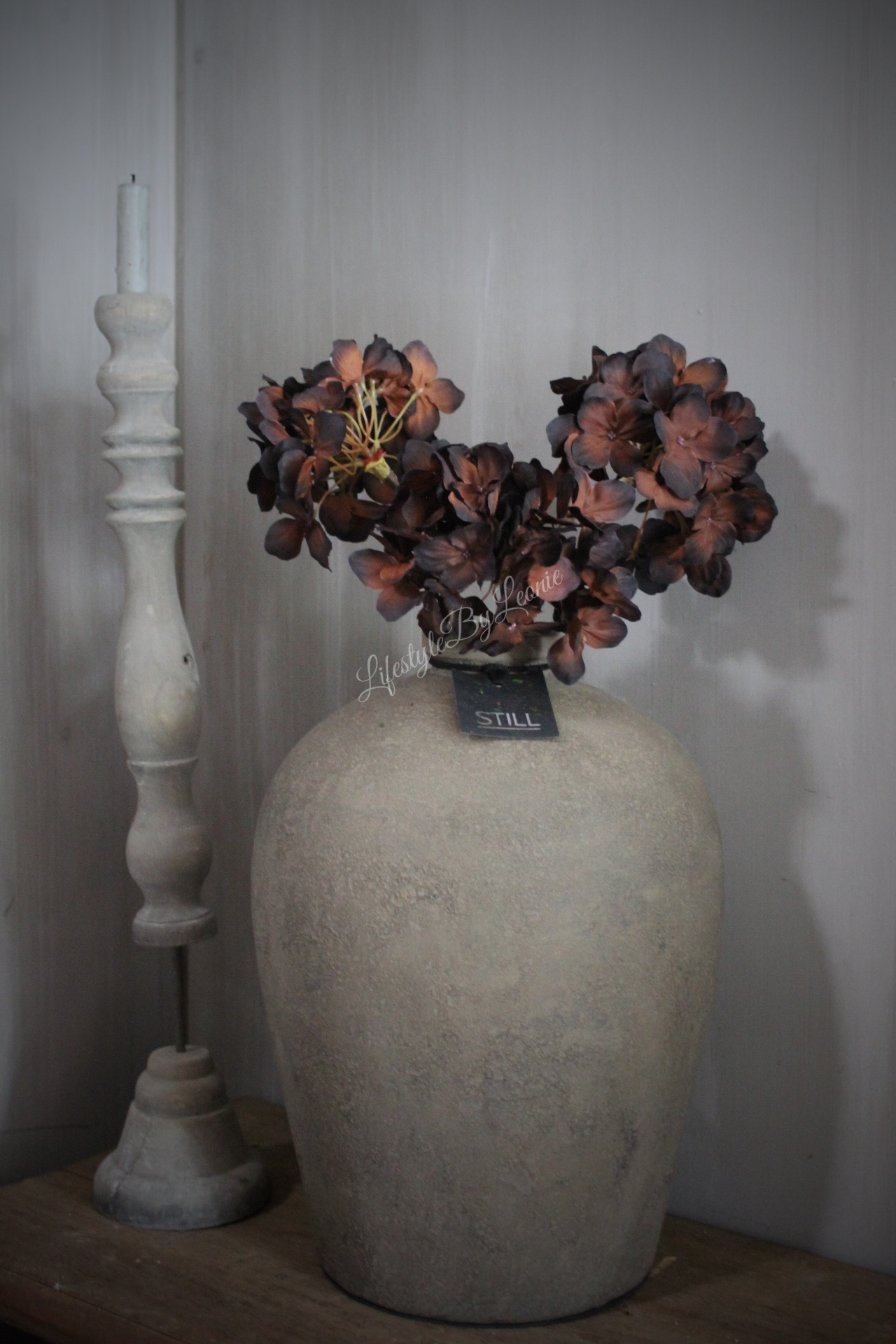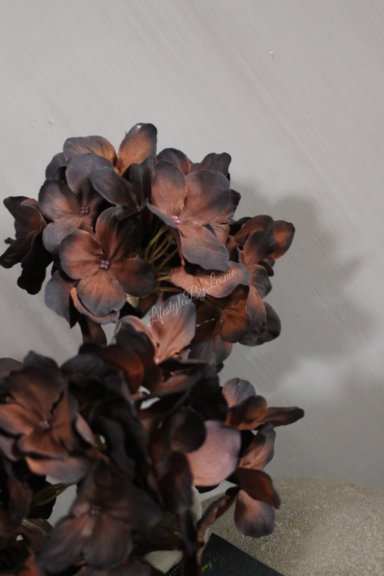 Mooie zijden kunst Hortensia in unieke sobere zwarte/brons kleur. Deze kunstbloem is 60 cm lang.