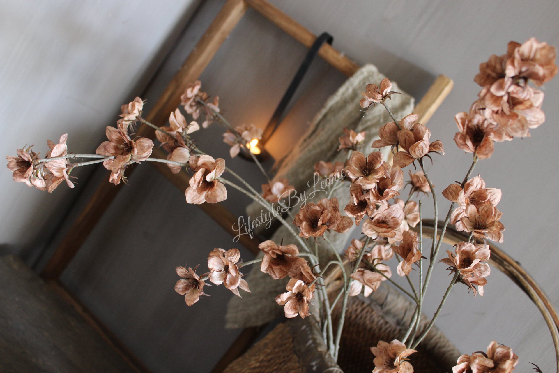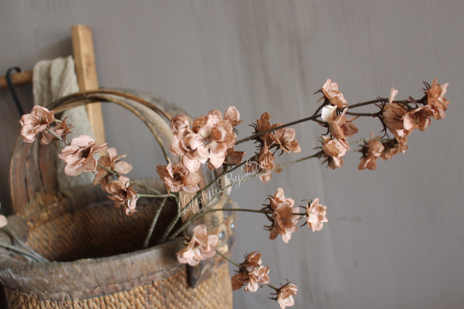 Mooie volle kunsttak met bruine bloemetjes. Een goede keuze voor wie op zoek is naar een warme herfsttint. De tak is 100 cm lang.