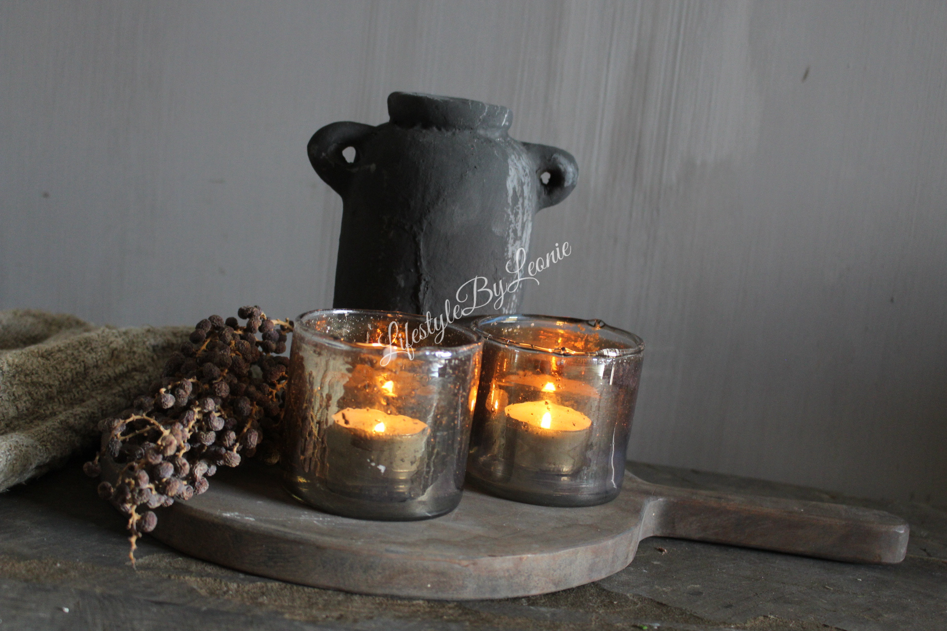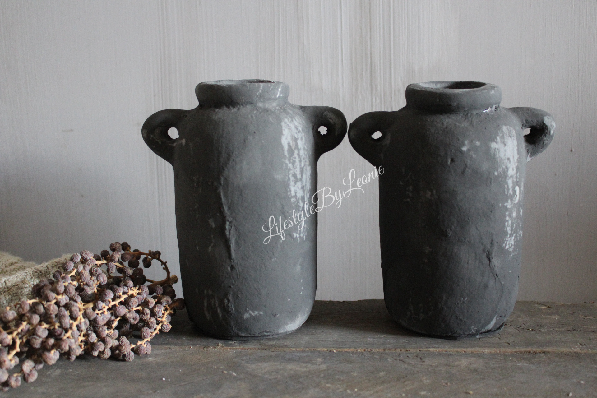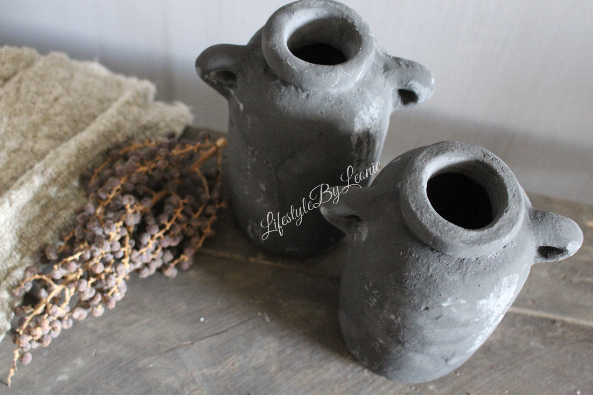 Mooi klein zwart stenen kruikje met oren. Het kruikje is 17 cm hoog.